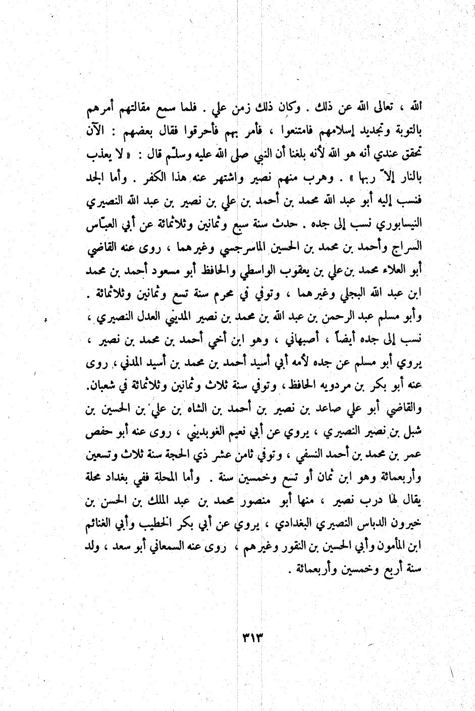 الله تَعَالَى الله عَن ذَلِك وَكَانَ ذَلِك زمن عَليّ فَلَمَّا سمع مقالتهم أَمرهم بِالتَّوْبَةِ وتجديد إسْلَامهمْ فامتنعوا فَأمر بهم فأحرقوا فَقَالَ بَعضهم الْآن تحقق عِنْدِي أَنه هُوَ الله لِأَنَّهُ بلغنَا أَن النَّبِي صلى الله عَلَيْهِ وَسلم قَالَ لَا يعذب بالنَّار إِلَّا رَبهَا وهرب مِنْهُم نصير واشتهر عَنهُ هَذَا الْكفْر وَأما الْجد فنسب إِلَيْهِ أبوعبد الله مُحَمَّد بن أَحْمد بن عَليّ بن نصير بن عبد الله النصيري النَّيْسَابُورِي نسب إِلَى جده حدث سنة سبع وَثَمَانِينَ وثلاثمائة عَن أبي الْعَبَّاس السراج وَأحمد بن مُحَمَّد بن الْحُسَيْن الماسرجسي وَغَيرهمَا روى عَنهُ القَاضِي أَبُو الْعَلَاء مُحَمَّد بن عَليّ بن يَعْقُوب الوَاسِطِيّ والحافظ أَبُو مَسْعُود أَحْمد بن مُحَمَّد ابْن عبد الله البَجلِيّ وَغَيرهمَا وَتُوفِّي فِي محرم سنة تسع وَثَمَانِينَ وثلاثمائة وَأَبُو مُسلم عبد الرَّحْمَن بن عبد الله بن مُحَمَّد بن نصير الْمَدِينِيّ الْعدْل النصيري نسب إِلَى جده أَيْضا أصبهاني وَهُوَ ابْن أخي أَحْمد بن مُحَمَّد بن نصير يروي أَبُو مُسلم عَن جده لأمه أبي أسيد أَحْمد بن مُحَمَّد بن أسيد الْمدنِي روى عَنهُ أَبُو بكر بن مرْدَوَيْه الْحَافِظ وَتُوفِّي سنة ثَلَاث وَثَمَانِينَ وثلاثمائة فِي شعْبَان وَالْقَاضِي أَبُو عَليّ صاعد بن نصير بن أَحْمد بن الشاه بن عَليّ بن الْحُسَيْن بن شبْل بن نصير النصيري يروي عَن أبي نعيم الغوبديني روى عَنهُ أَبُو حَفْص عمر بن مُحَمَّد بن أَحْمد النَّسَفِيّ وَتُوفِّي ثامن عشر ذِي الْحجَّة سنة ثَلَاث وَتِسْعين وَأَرْبَعمِائَة وَهُوَ ابْن ثَمَان أَو تسع وَخمسين سنة واما الْمحلة فَفِي بَغْدَاد محلّة يُقَال لَهَا درب نصير مِنْهَا أَبُو مَنْصُور مُحَمَّد بن عبد الْملك بن الْحسن بن خيرون الدباس النصيري الْبَغْدَادِيّ يروي عَن أبي بكر الْخَطِيب وَأبي الْغَنَائِم ابْن الْمَأْمُون وَأبي الْحُسَيْن بن النقور وَغَيرهم روى عَنهُ السَّمْعَانِيّ أَبُو سعد ولد سنة أَربع وَخمسين وَأَرْبَعمِائَة