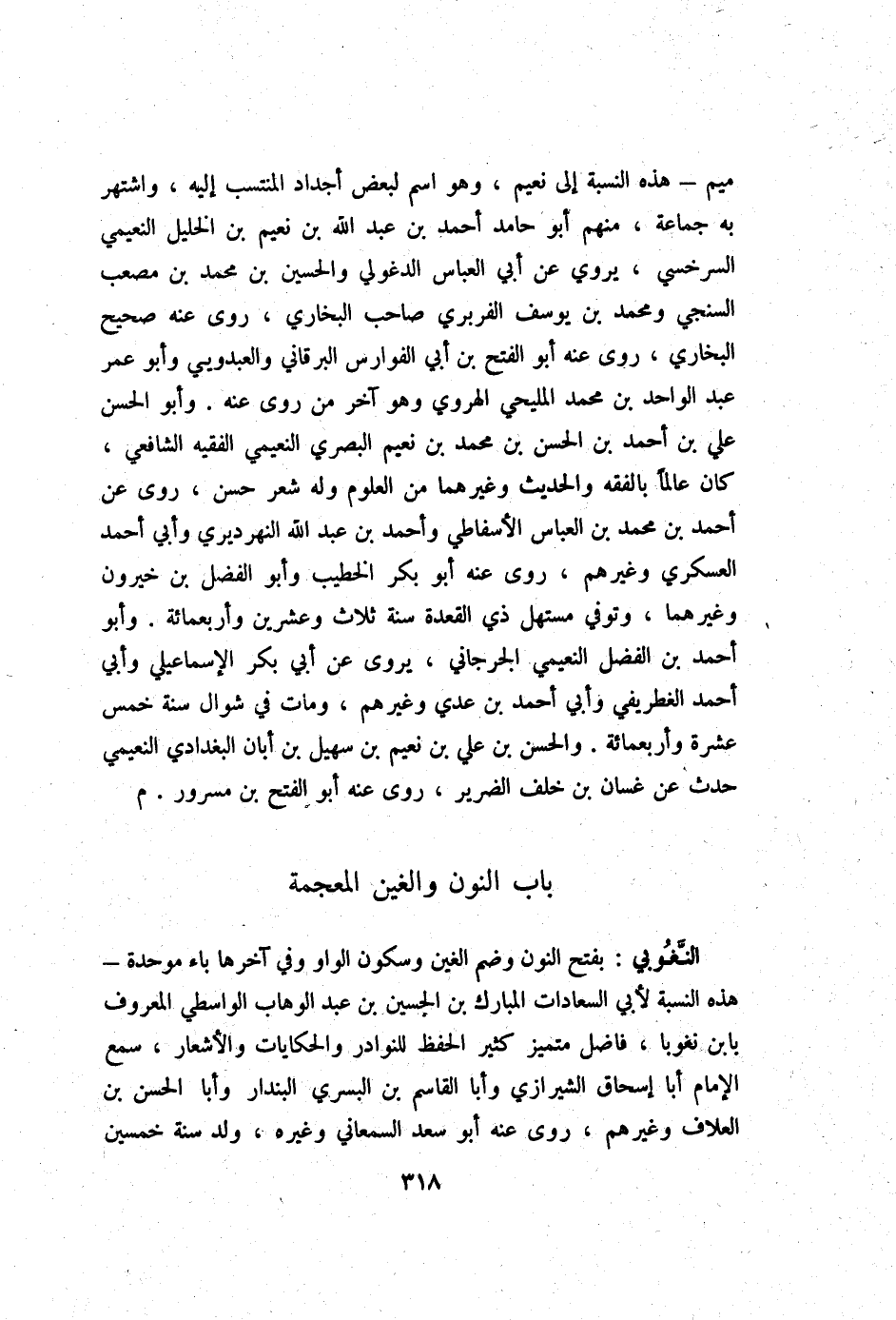 مِيم هَذِه النِّسْبَة إِلَى نعيم وَهُوَ اسْم لبَعض أجداد المنتسب إِلَيْهِ واشتهر بِهِ جمَاعَة مِنْهُم أَبُو حَامِد أَحْمد بن عبد الله بن نعيم بن الْخَلِيل النعيمي السَّرخسِيّ يروي عَن أبي الْعَبَّاس الدغولي وَالْحُسَيْن بن مُحَمَّد بن مُصعب السنجي وَمُحَمّد بن يُوسُف الْفربرِي صَاحب البُخَارِيّ روى عَنهُ صَحِيح البُخَارِيّ روى عَنهُ أَبُو الْفَتْح بن أبي الفوارس البرقاني والعبدويي وَأَبُو عمر عبد الْوَاحِد بن مُحَمَّد المليحي الْهَرَوِيّ وَهُوَ آخر من روى عَنهُ وَأَبُو الْحسن عَليّ بن أَحْمد بن الْحسن بن مُحَمَّد بن نعيم الْبَصْرِيّ النعيمي الْفَقِيه الشَّافِعِي كَانَ عَالما بالفقه والْحَدِيث وَغَيرهمَا من الْعُلُوم وَله شعر حسن روى عَنهُ أَحْمد بن مُحَمَّد بن الْعَبَّاس الْأَسْفَاطِي وَأحمد بن عبد الله النهرديري وَأبي أَحْمد العسكري وَغَيرهم روى عَنهُ أَبُو بكر الْخَطِيب وَأَبُو الْفضل بن خيرون وَغَيرهمَا وَتُوفِّي مستهل ذِي الْقعدَة سنة ثَلَاث وَعشْرين وَأَرْبَعمِائَة وَأَبُو أَحْمد بن الْفضل النعيمي الْجِرْجَانِيّ يرْوى عَن أبي بكر الْإِسْمَاعِيلِيّ وَأبي أَحْمد الغطريفي وَأبي أَحْمد بن عدي وَغَيرهم وَمَات فِي شَوَّال سنة خمس عشرَة وَأَرْبَعمِائَة وَالْحسن بن عَليّ بن نعيم بن سُهَيْل بن أبان الْبَغْدَادِيّ النعيمي حدث عَن غَسَّان بن خلف الضَّرِير روى عَنهُ أَبُو الْفَتْح بن مسرور م