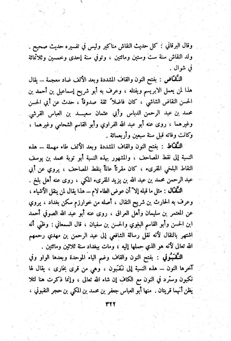 النقال مثل مَا قبله إِلَّا أَن عوض الطَّاء لَام هَذَا يُقَال لمن ينْقل الْأَشْيَاء وَعرف بِهِ الْحَارِث بن شُرَيْح النقال أَصله من خوارزم سكن بَغْدَاد يروي عَن الْمُعْتَمِر بن سُلَيْمَان وَأهل الْعرَاق روى عَنهُ أَبُو عبد الله الصُّوفِي أَحْمد ابْن الْحسن وَأَبُو الْقَاسِم الْبَغَوِيّ وَالْحسن بن سُفْيَان قَالَ السَّمْعَانِيّ وظني أَنه اشْتهر بالنقال لِأَنَّهُ نقل رِسَالَة الشَّافِعِي إِلَى عبد الرَّحْمَن بن مهْدي رَحِمهم الله تَعَالَى لِأَنَّهُ هُوَ الَّذِي حملهَا إِلَيْهِ وَمَات بِبَغْدَاد سنة ثَلَاثِينَ وَمِائَتَيْنِ النقبوني بِفَتْح النُّون وَالْقَاف وَضم الْبَاء الموحده وَبعدهَا الْوَاو وَفِي آخرهَا النُّون هَذِه النِّسْبَة إِلَى نقبون وَهِي من قرى بُخَارى يُقَال لَهَا نكبون وسترد فِي النُّون مَعَ الْكَاف إِن شَاءَ الله تَعَالَى وَإِنَّمَا ذكرت هُنَا لِئَلَّا يظنّ أَنَّهُمَا قَرْيَتَانِ مِنْهَا أَبُو الْعَبَّاس جَعْفَر بن مُحَمَّد بن الْمَكِّيّ بن حجر النقبوني