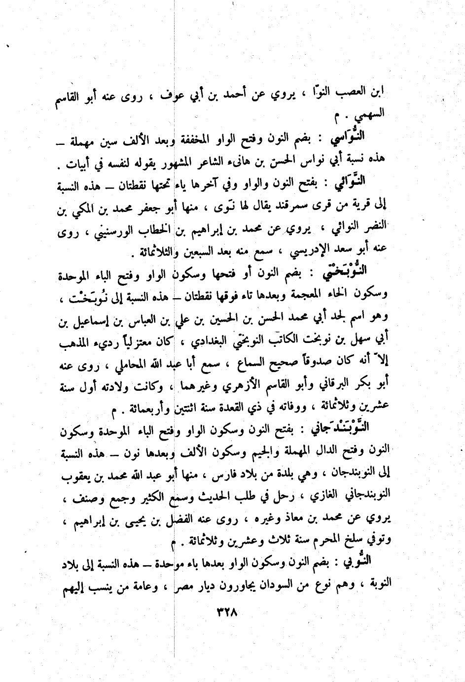النوبختي بِضَم النُّون أَو فتحهَا وَسُكُون الْوَاو وَفتح الْبَاء الْمُوَحدَة وَسُكُون الْخَاء الْمُعْجَمَة وَبعدهَا تَاء فَوْقهَا نقطتان هَذِه النِّسْبَة إِلَى نوبخت وَهُوَ اسْم لجد أبي مُحَمَّد الْحسن بن الْحُسَيْن بن عَليّ بن الْعَبَّاس بن إِسْمَاعِيل بن ابي سهل بن نوبخت الْكَاتِب النوبختي الْبَغْدَادِيّ كَانَ معتزليا رَدِيء الْمَذْهَب إِلَّا أَنه كَانَ صَدُوقًا صَحِيح السماع سمع أَبَا عبد الله الْمحَامِلِي روى عَنهُ ابو بكر البرقاني وَأَبُو الْقَاسِم الْأَزْهَرِي وَغَيرهمَا وَكَانَت وِلَادَته أول سنة عشْرين وثلاثمائة ووفاته فِي ذِي الْقعدَة سنة اثْنَتَيْنِ واربعمائة م