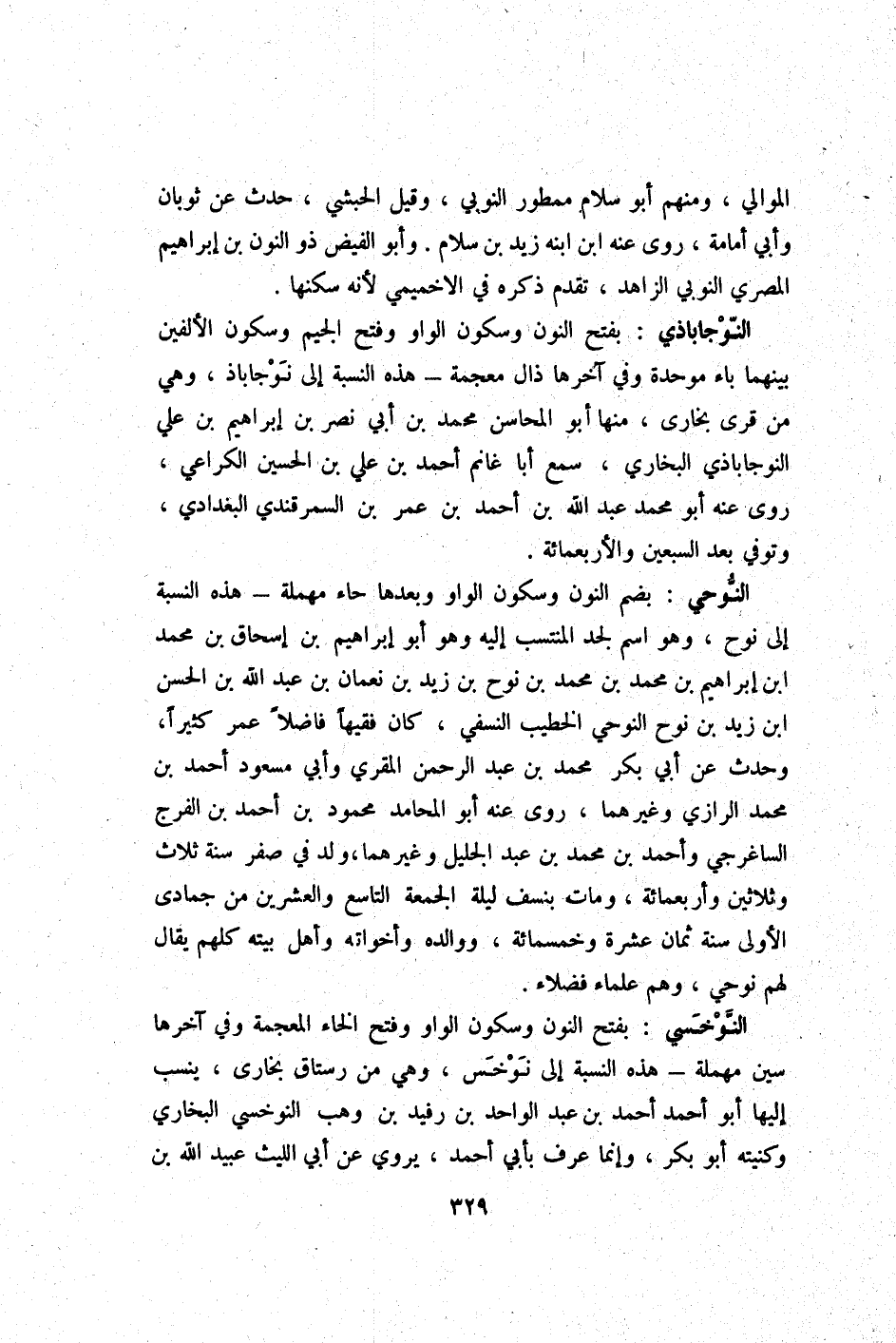 النوحي بِضَم النُّون وَسُكُون الْوَاو وَبعدهَا حاء مُهْملَة هَذِه النِّسْبَة إِلَى نوح وَهُوَ اسْم لجد المنتسب إِلَيْهِ وَهُوَ أَبُو إِبْرَاهِيم بن اسحاق بن مُحَمَّد ابْن إِبْرَاهِيم بن مُحَمَّد بن مُحَمَّد بن نوح بن زيد بن نعْمَان بن عبد الله بن الْحسن ابْن زيد بن نوح النوحي الْخَطِيب النَّسَفِيّ كَانَ فَقِيها فَاضلا عمر كثيرا وَحدث عَن أبي بكر مُحَمَّد بن عبد الرَّحْمَن الْمقري وَأبي مَسْعُود أَحْمد بن مُحَمَّد الرَّازِيّ وَغَيرهمَا روى عَنهُ أَبُو المحامد مَحْمُود بن أَحْمد بن الْفرج الساغرجي وَأحمد بن مُحَمَّد بن عبد الْجَلِيل وَغَيرهمَا ولد فِي صفر سنة ثَلَاث وَثَلَاثِينَ وَأَرْبَعمِائَة وَمَات بنسف لَيْلَة الْجُمُعَة التَّاسِع وَالْعِشْرين من جُمَادَى الأوى سنة ثَمَان عشرَة وَخَمْسمِائة ووالده وأخواته وَأهل بَيته كلهم يُقَال لَهُم نوحي وهم عُلَمَاء فضلاء