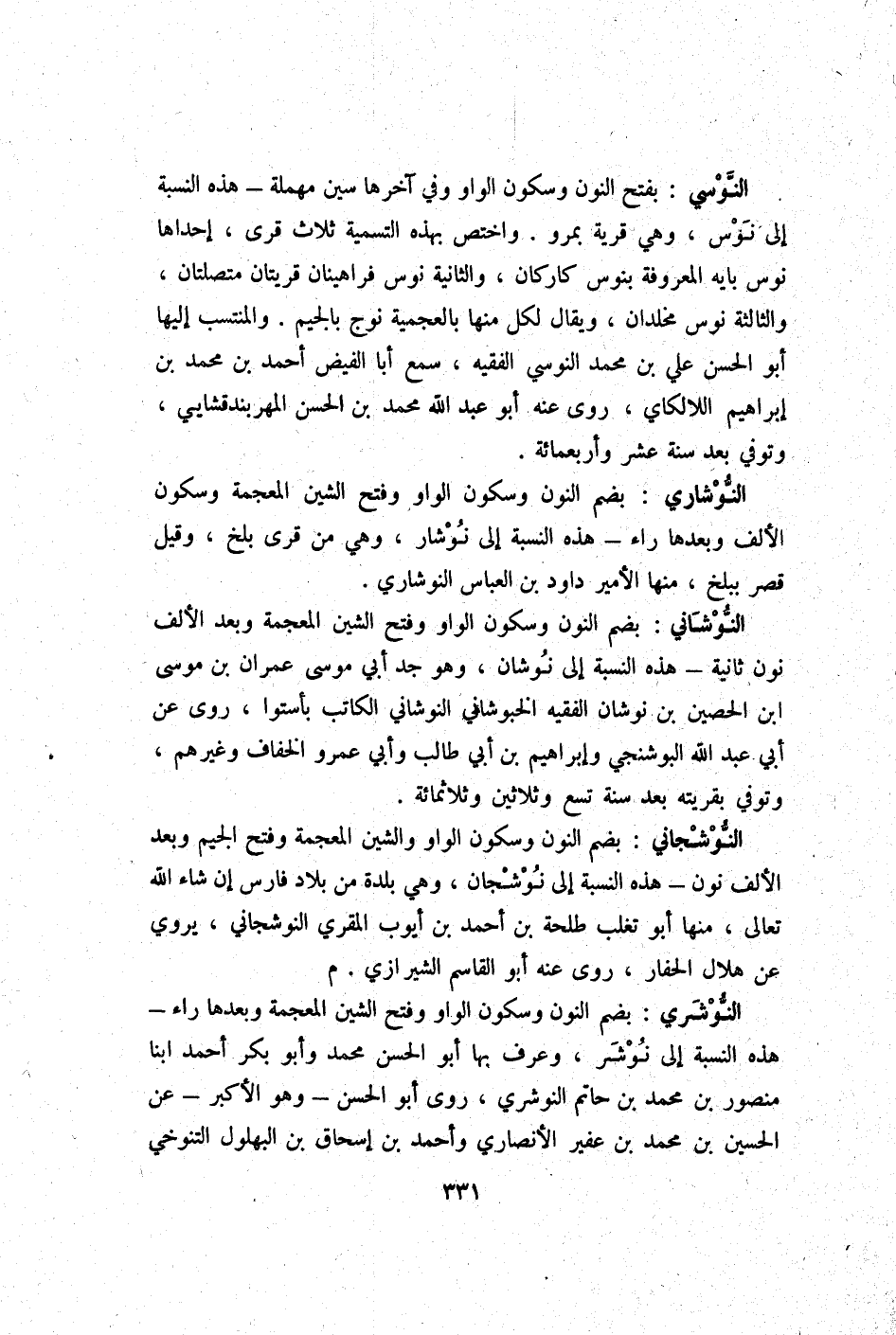 النوسي بِفَتْح النُّون وَسُكُون الْوَاو وَفِي آخرهَا سين مُهْملَة هَذِه النِّسْبَة إِلَى نوس وَهِي قَرْيَة بمرو واختص بِهَذِهِ التَّسْمِيَة ثَلَاث قرى إِحْدَاهَا نوس بايه الْمَعْرُوفَة بنوس كاركان وَالثَّانيَِة نوس فراهينان قَرْيَتَانِ متصلتان وَالثَّالِث نوس مخلدان وَيُقَال لكل مِنْهَا بالعجمية نوج بِالْجِيم والمنتسب إِلَيْهَا أَبُو الْحسن عَليّ بن مُحَمَّد النوسي الْفَقِيه سمع أَبَا الْفَيْض احْمَد بن مُحَمَّد بن إِبْرَاهِيم اللالكاي روى عَنهُ ابو عبد الله مُحَمَّد بن الْحسن المهربندقشايي وَتُوفِّي بعد سنة عشر وَأَرْبَعمِائَة