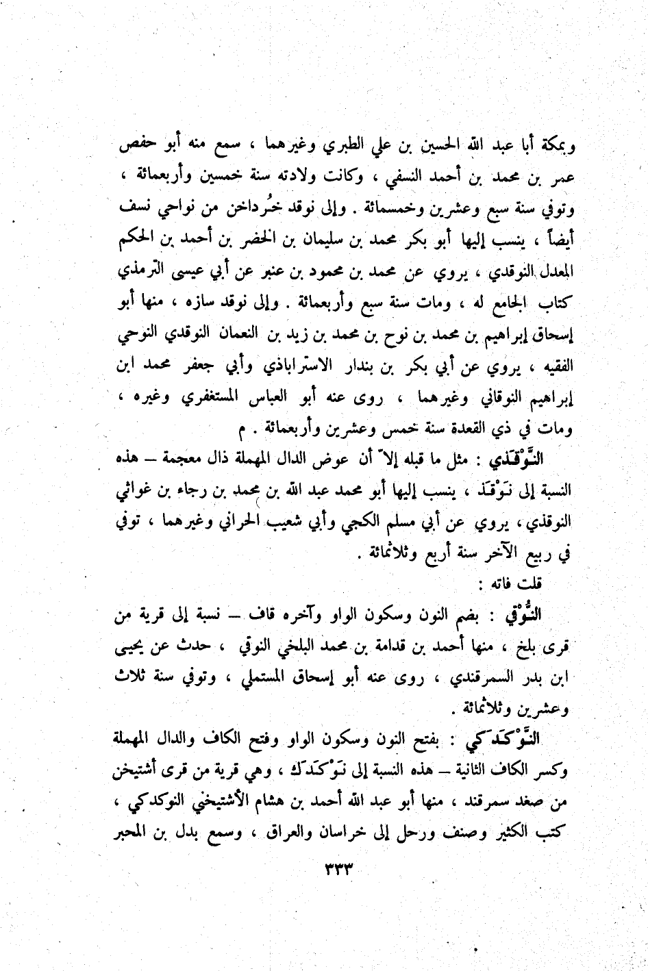 وبمكة أَبَا عبد الله الْحُسَيْن بن عَليّ الطَّبَرِيّ وَغَيرهمَا سمع مِنْهُ أَبُو حَفْص عمر بن مُحَمَّد بن أَحْمد النَّسَفِيّ وَكَانَت وِلَادَته سنة خمسين وَأَرْبَعمِائَة وَتُوفِّي سنة سبع وَعشْرين وَخَمْسمِائة وَإِلَى نوقد خرداخن من نواحي نسف أَيْضا ينْسب إِلَيْهَا ابو بكر مُحَمَّد بن سُلَيْمَان بن الْخضر بن أَحْمد بن الحكم الْمعدل النوقدي يروي عَن مُحَمَّد بن مَحْمُود بن عنبر عَن أبي عِيسَى التِّرْمِذِيّ كتاب الْجَامِع لَهُ وَمَات سنة سبع وَأَرْبَعمِائَة وَإِلَى نوقد سازه مِنْهَا أَبُو اسحاق إِبْرَاهِيم بن مُحَمَّد بن نوح بن مُحَمَّد بن زيد بن النُّعْمَان النوقدي النوحي الْفَقِيه يروي عَن أبي بكر بن بنْدَار الاستراباذي وَأبي جَعْفَر مُحَمَّد ابْن إِبْرَاهِيم النوقاني وَغَيرهمَا روى عَنهُ أَبُو الْعَبَّاس المستغفري وَغَيره وَمَات فِي ذِي الْقعدَة سنة خمس وَعشْرين أَرْبَعمِائَة م