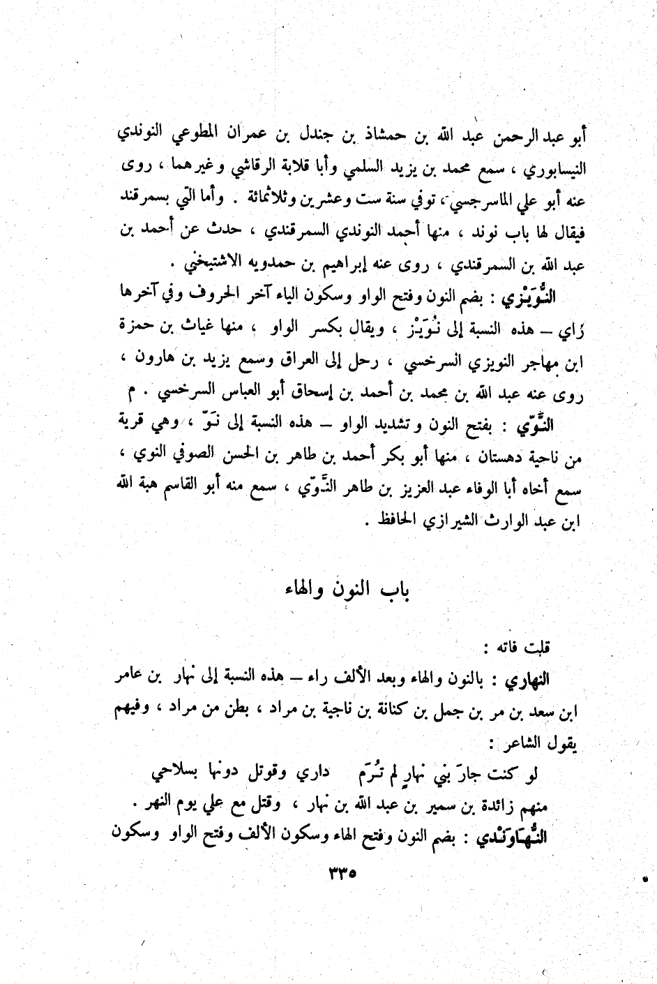 النوي بِفَتْح النُّون وَتَشْديد الْوَاو هَذِه النِّسْبَة إِلَى نو وَهِي قَرْيَة من نَاحيَة دهستان مِنْهَا أَبُو بكر أَحْمد بن طَاهِر بن الْحسن الصُّوفِي النوي سمع أَخَاهُ أَبَا الْوَفَاء عبد الْعَزِيز بن طَاهِر النوي سمع مِنْهُ أَبُو الْقَاسِم هبة الله ابْن عبد الْوَارِث الشِّيرَازِيّ الْحَافِظ