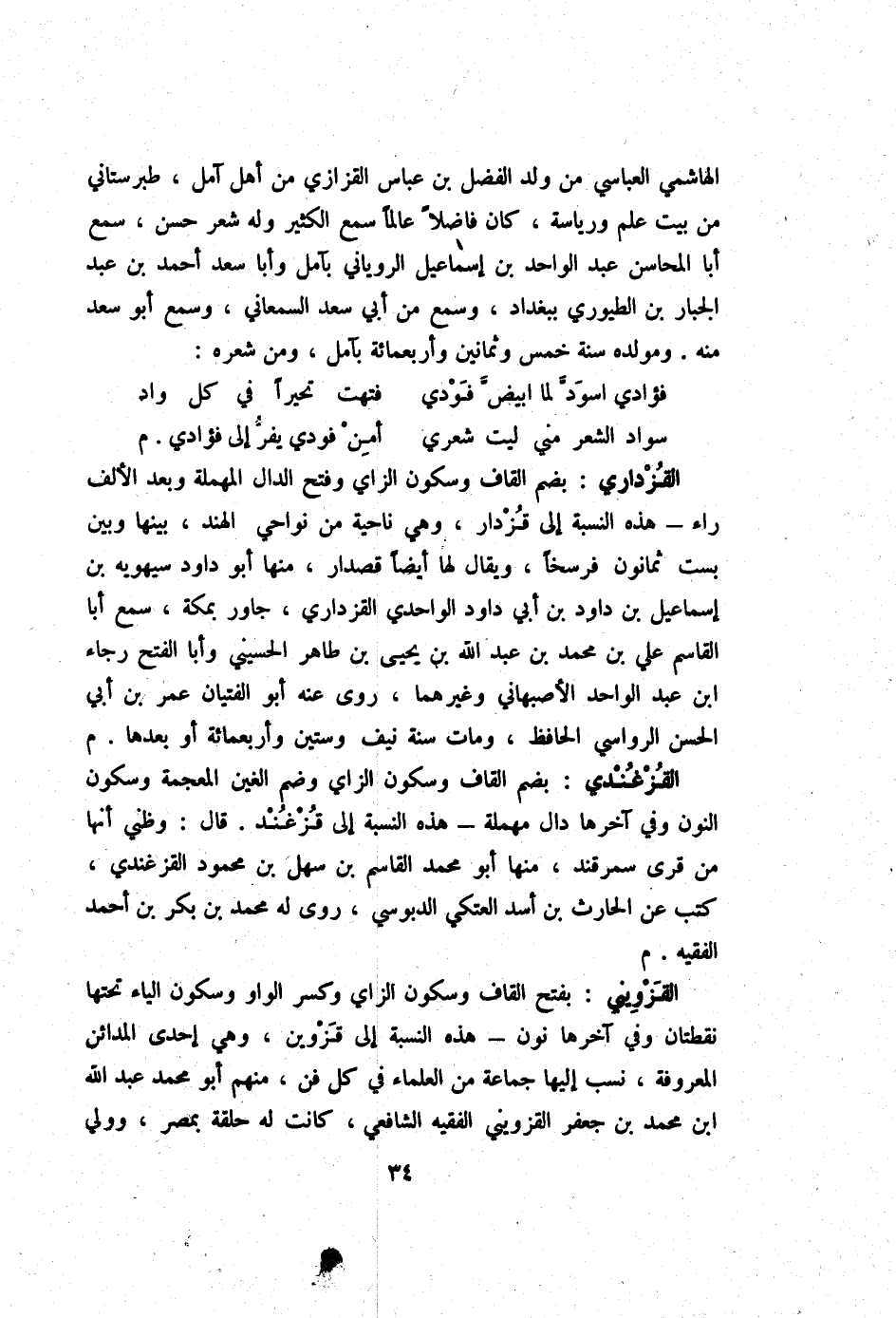 الْقزْوِينِي بِفَتْح الْقَاف وَسُكُون الزَّاي وَكسر الْوَاو وَسُكُون الْيَاء تحتهَا نقطتان وَفِي آخرهَا نون هَذِه النِّسْبَة إِلَى قزوين وَهِي إِحْدَى الْمَدَائِن الْمَعْرُوفَة نسب إِلَيْهَا جمَاعَة من الْعلمَاء فِي كل فن مِنْهُم أَبُو مُحَمَّد عبد الله ابْن مُحَمَّد بن جَعْفَر الْقزْوِينِي الْفَقِيه الشَّافِعِي كَانَت لَهُ حَلقَة بِمصْر وَولي