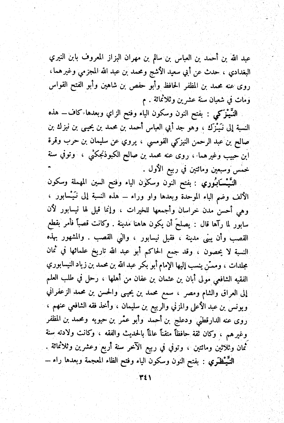 النَّيْسَابُورِي بِفَتْح النُّون وَسُكُون الْيَاء وَفتح السِّين الْمُهْملَة وَسُكُون الْألف وَضم الْبَاء الموحد وَبعدهَا وَاو وَرَاء هَذِه النِّسْبَة إِلَى نيسابور وَهِي أحسن مدن خُرَاسَان وأجمعها لِلْخَيْرَاتِ وَإِنَّمَا قيل لَهَا نيسابور لِأَن سَابُور لما رَآهَا قَالَ يصلح أَن يكون هَاهُنَا مَدِينَة وَكَانَت قصبا فَأمر بِقطع الْقصب وَأَن يبْنى مَدِينَة فَقيل نيسابور والني الْقصب وَالْمَشْهُور بِهَذِهِ النِّسْبَة لَا يُحصونَ وَقد جمع الْحَاكِم أَبُو عبد الله تَارِيخ علمائها فِي ثَمَان مجلدات وَمِمَّنْ ينْسب إِلَيْهَا الإِمَام أَبُو بكر عبد الله بن مُحَمَّد بن زِيَاد النَّيْسَابُورِي الْفَقِيه الشَّافِعِي مولى ابان بن عُثْمَان بن عَفَّان من أَهلهَا رَحل فِي طلب الْعلم إِلَى الْعرَاق وَالشَّام ومصر سمع مُحَمَّد بن يحيى وَالْحسن بن مُحَمَّد الزَّعْفَرَانِي وَيُونُس بن عبد الْأَعْلَى والمزني وَالربيع بن سُلَيْمَان وَأخذ فقه الشَّافِعِي عَنْهُم روى عَنهُ الدَّارَقُطْنِيّ ودعلج بن أَحْمد وَأَبُو عمر بن حيويه وَمُحَمّد بن المظفر وَغَيرهم وَكَانَ ثِقَة حَافِظًا متقنا عَالما بِالْحَدِيثِ وَالْفِقْه وَكَانَت وِلَادَته سنة ثَمَان وَثَلَاثِينَ وَمِائَتَيْنِ وَتُوفِّي فِي ربيع الآخر سنة أَربع وَعشْرين وثلاثمائة.