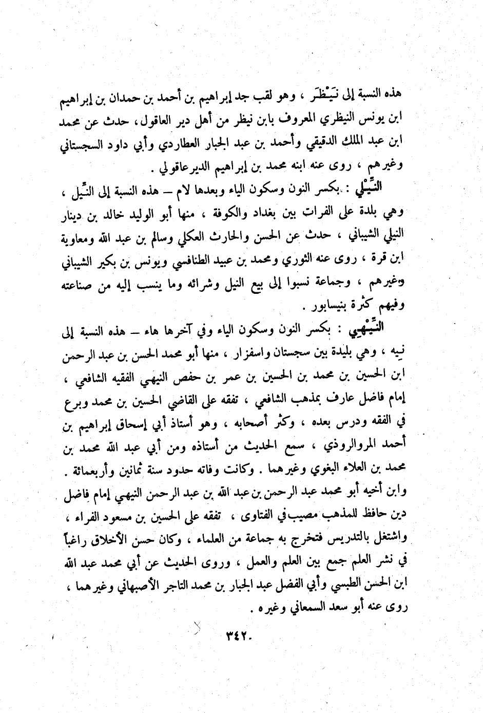 النيهي بِكَسْر النُّون وَسُكُون الْيَاء وَفِي آخرهَا هَاء هَذِه النِّسْبَة إِلَى نيه وَهِي بليدَة بَين سجستان واسفزار مِنْهَا أَبُو مُحَمَّد الْحسن بن عبد الرَّحْمَن ابْن الْحُسَيْن بن مُحَمَّد بن الْحُسَيْن بن عمر بن حَفْص النيهي الْفَقِيه الشَّافِعِي إِمَام فَاضل عَارِف بِمذهب الشَّافِعِي تفقه على القَاضِي الْحُسَيْن بن مُحَمَّد وبرع فِي الْفِقْه ودرس بعده وَكثر أَصْحَابه وَهُوَ استاذ أبي اسحاق إِبْرَاهِيم بن أَحْمد المرو الروذي سمع الحَدِيث من استاذه وَمن أبي عبد الله مُحَمَّد بن مُحَمَّد بن الْعَلَاء الْبَغَوِيّ وَغَيرهمَا وَكَانَت وَفَاته حُدُود سنة ثَمَانِينَ وَأَرْبَعمِائَة وَابْن أَخِيه أَبُو مُحَمَّد عبد الرَّحْمَن بن عبد الله بن عبد الرَّحْمَن النيهي إِمَام فَاضل دين حَافظ للْمَذْهَب مُصِيب فِي الْفَتَاوَى تفقه على الْحُسَيْن بن مَسْعُود الْفراء واشتغل بالتدريس فَتخرج بِهِ جمَاعَة من الْعلمَاء وَكَانَ حسن الْأَخْلَاق رَاغِبًا فِي نشر الْعلم جمع بَين الْعلم وَالْعَمَل وروى الحَدِيث عَن أبي مُحَمَّد عبد الله ابْن الْحسن الطبسي وَأبي الْفضل عبد الْجَبَّار بن مُحَمَّد التَّاجِر الْأَصْبَهَانِيّ وَغَيرهمَا روى عَنهُ أَبُو سعد السَّمْعَانِيّ وَغَيره