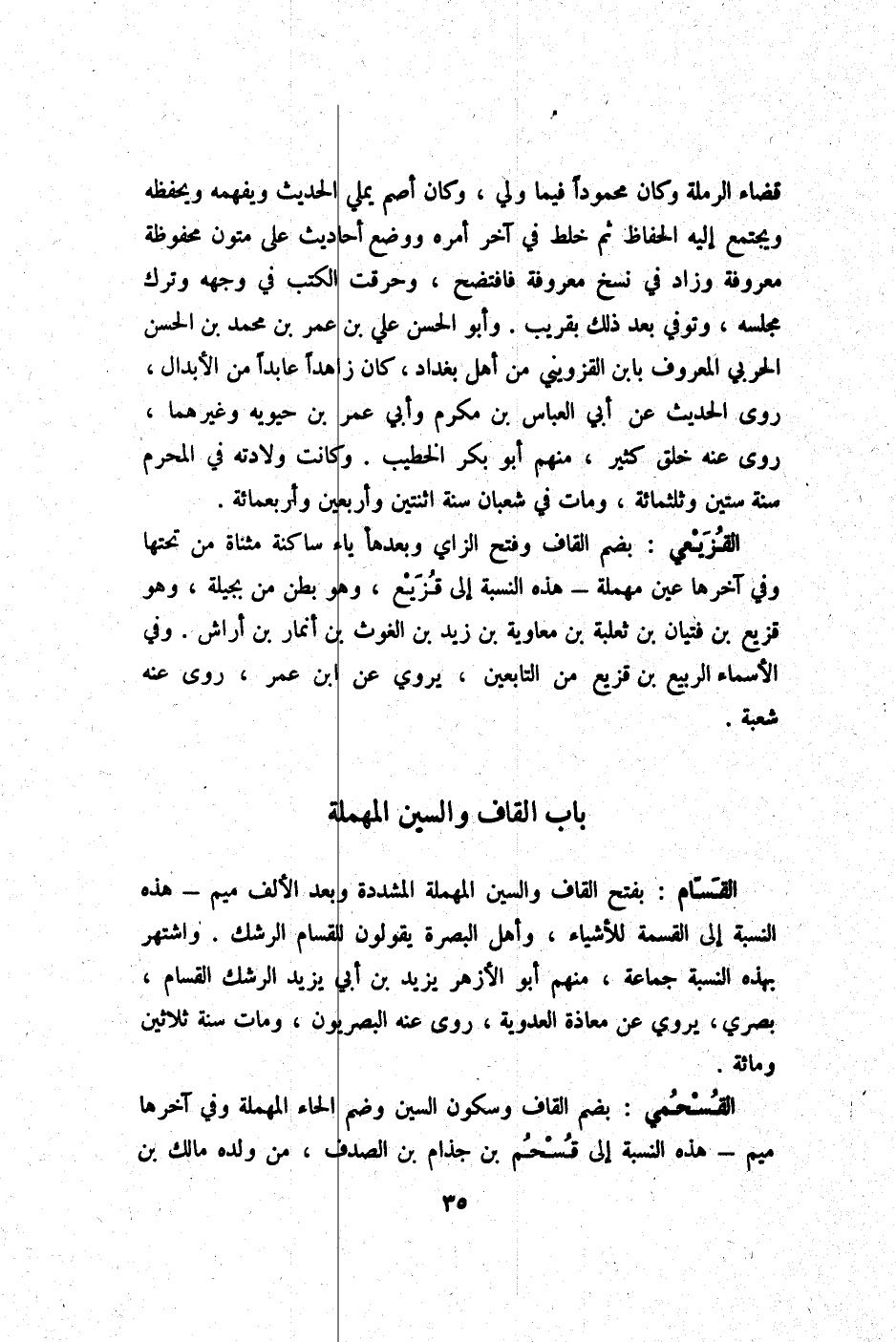 قَضَاء الرملة وَكَانَ مَحْمُودًا فِيمَا ولي وَكَانَ أَصمّ يملي الحَدِيث ويفهمه ويحفظه ويجتمع إِلَيْهِ الْحفاظ ثمَّ خلط فِي آخر أمره وَوضع أَحَادِيث على متون مَحْفُوظَة مَعْرُوفَة وَزَاد فِي نسخ مَعْرُوفَة فافتضح وَحرقت الْكتب فِي وَجهه وَترك مَجْلِسه وَتُوفِّي بعد ذَلِك بقريب وَأَبُو الْحسن عَليّ بن عمر بن مُحَمَّد بن الْحسن الْحَرْبِيّ الْمَعْرُوف بِابْن الْقزْوِينِي من أهل بَغْدَاد كَانَ زاهدا عابدا من الأبدال روى الحَدِيث عَن أبي الْعَبَّاس بن مكرم وَأبي عمر بن حيويه وَغَيرهمَا روى عَنهُ خلق كثير مِنْهُم أَبُو بكر الْخَطِيب وَكَانَت وِلَادَته فِي الْمحرم سنة سِتِّينَ وثلثمائة وَمَات فِي شعْبَان سنة اثْنَتَيْنِ وَأَرْبَعين وَأَرْبَعمِائَة