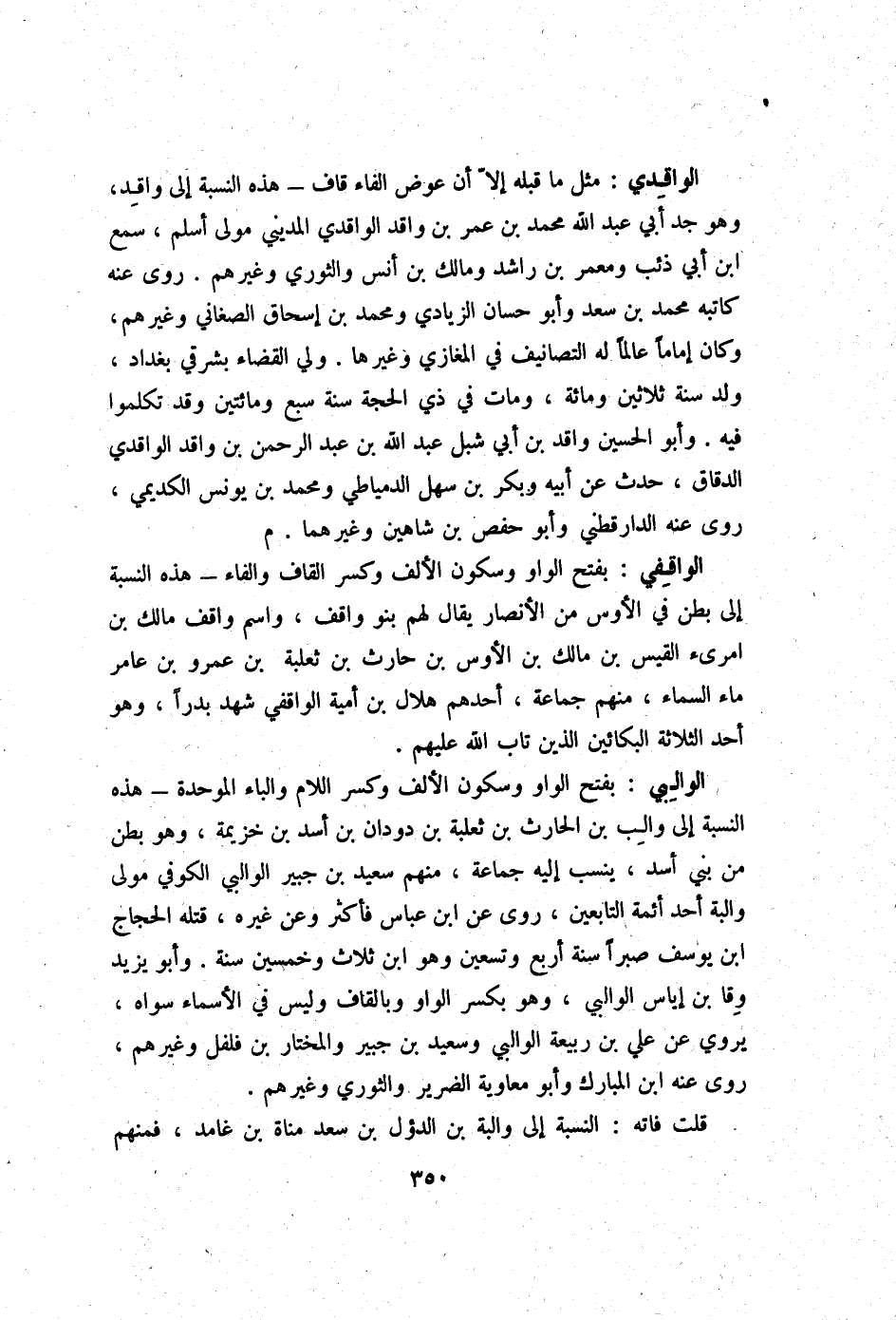 الْوَاقِدِيّ مثل مَا قبله إِلَّا أَن عوض الْفَاء قَاف هَذِه النِّسْبَة إِلَى وَاقد وَهُوَ جد أبي عبد الله مُحَمَّد بن عمر بن وَاقد الْوَاقِدِيّ الْمَدِينِيّ مولى أسلم سمع ابْن أبي ذِئْب وَمعمر بن رَاشد وَمَالك بن أنس وَالثَّوْري وَغَيرهم روى عَنهُ كَاتبه مُحَمَّد بن سعد وَأَبُو حسان الزيَادي وَمُحَمّد بن اسحاق الصغاني وَغَيرهم وَكَانَ إِمَامًا عَالما لَهُ التصانيف فِي الْمَغَازِي وَغَيرهَا ولي الْقَضَاء بشرقي بَغْدَاد ولد سنة ثَلَاثِينَ وَمِائَة وَمَات فِي ذِي الْحجَّة سنة سبع وَمِائَتَيْنِ وَقد تكلمُوا فِيهِ وَأَبُو الْحُسَيْن وَاقد بن أبي شبْل عبد الله بن عبد الرَّحْمَن بن وَاقد الْوَاقِدِيّ الدقاق حدث عَن أَبِيه وَبكر بن سهل الدمياطي وَمُحَمّد بن يُونُس الْكُدَيْمِي روى عَنهُ الدَّارَقُطْنِيّ وَأَبُو حَفْص بن شاهين وَغَيرهمَا م