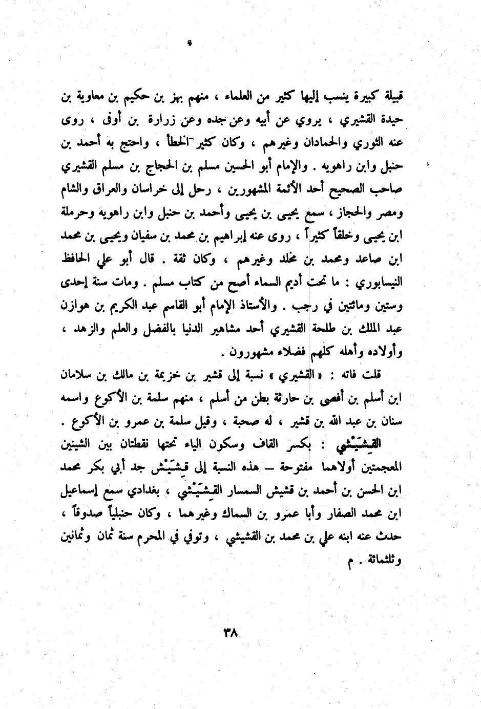 قَبيلَة كَبِيرَة ينْسب إِلَيْهَا كثير من الْعلمَاء مِنْهُم بهز بن حَكِيم بن مُعَاوِيَة بن حيدة الْقشيرِي يروي عَن أَبِيه وَعَن جده وَعَن زُرَارَة بن أوفى روى عَنهُ الثَّوْريّ والحمادان وَغَيرهم وَكَانَ كثير الْخَطَأ وَاحْتج بِهِ أَحْمد بن حَنْبَل وَابْن رَاهَوَيْه وَالْإِمَام أَبُو الْحُسَيْن مُسلم بن الْحجَّاج بن مُسلم الْقشيرِي صَاحب الصَّحِيح أحد الْأَئِمَّة الْمَشْهُورين رَحل إِلَى خُرَاسَان وَالْعراق وَالشَّام ومصر والحجاز سمع يحيى بن يحيى وَأحمد بن حَنْبَل وَابْن رَاهَوَيْه وحرملة ابْن يحيى وخلقا كثيرا روى عَنهُ إِبْرَاهِيم بن مُحَمَّد بن سُفْيَان وَيحيى بن مُحَمَّد ابْن صاعد وَمُحَمّد بن مخلد وَغَيرهم وَكَانَ ثِقَة قَالَ أَبُو عَليّ الْحَافِظ النَّيْسَابُورِي مَا تَحت أَدِيم السَّمَاء أصح من كتاب مُسلم وَمَات سنة إِحْدَى وَسِتِّينَ وَمِائَتَيْنِ فِي رَجَب والأستاذ الإِمَام أَبُو الْقَاسِم عبد الْكَرِيم بن هوَازن عبد الْملك بن طَلْحَة الْقشيرِي أحد مشاهير الدُّنْيَا بِالْفَضْلِ وَالْعلم والزهد وَأَوْلَاده وَأَهله كلهم فضلاء مَشْهُورُونَ