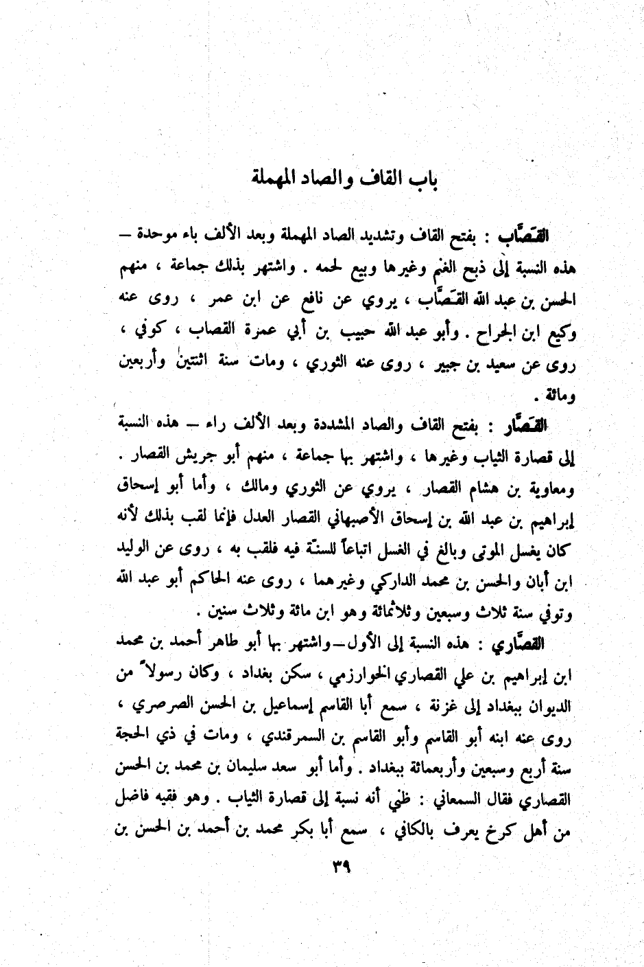 القصاب بِفَتْح الْقَاف وَتَشْديد الصَّاد الْمُهْملَة وَبعد الْألف بَاء مُوَحدَة هَذِه النِّسْبَة إِلَى ذبح الْغنم وَغَيرهَا وَبيع لَحْمه واشتهر بذلك جمَاعَة مِنْهُم الْحسن بن عبد الله القصاب يروي عَن نَافِع عَن ابْن عمر روى عَنهُ وَكِيع ابْن الْجراح وَأَبُو عبد الله حبيب بن أبي عمْرَة القصاب كُوفِي روى عَن سعيد بن جُبَير روى عَنهُ الثَّوْريّ وَمَات سنة اثْنَتَيْنِ وَأَرْبَعين وَمِائَة