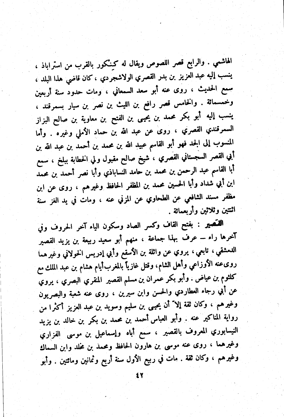 الْهَاشِمِي وَالرَّابِع قصر اللُّصُوص وَيُقَال لَهُ كنكور بِالْقربِ من استراباذ ينْسب إِلَيْهِ عبد الْعَزِيز بن بدر القصري الولاشجردي كَانَ قَاضِي هَذَا الْبَلَد سمع الحَدِيث روى عَنهُ أَبُو سعد السَّمْعَانِيّ وَمَات حُدُود سنة أَرْبَعِينَ وَخَمْسمِائة وَالْخَامِس قصر رَافع بن اللَّيْث بن نصر بن سيار بسمرقند ينْسب إِلَيْهِ أَبُو بكر مُحَمَّد بن يحيى بن الْفَتْح بن مُعَاوِيَة بن صَالح الْبَزَّاز السَّمرقَنْدِي القصري روى عَن عبد الله بن حَمَّاد الأملي وَغَيره وَأما الْمَنْسُوب إِلَى الْجد فَهُوَ أَبُو الْقَاسِم عبيد الله بن مُحَمَّد بن أَحْمد بن عبد الله بن أبي الْقصر السجسْتانِي القصري شيخ صَالح مَقْبُول ولي الخطابة ببلخ سمع أَبَا الْقَاسِم عبد الرَّحْمَن بن مُحَمَّد بن حَامِد النساباذي وَأَبا نصر أَحْمد بن مُحَمَّد ابْن أبي شَدَّاد وَأَبا الْحُسَيْن مُحَمَّد بن المظفر الْحَافِظ وَغَيرهم روى عَن ابْن مظفر مُسْند الشَّافِعِي عَن الطَّحَاوِيّ عَن الْمُزنِيّ عَنهُ وَمَات فِي يَد الغز سنة اثْنَتَيْنِ وَثَلَاثِينَ وَأَرْبَعمِائَة