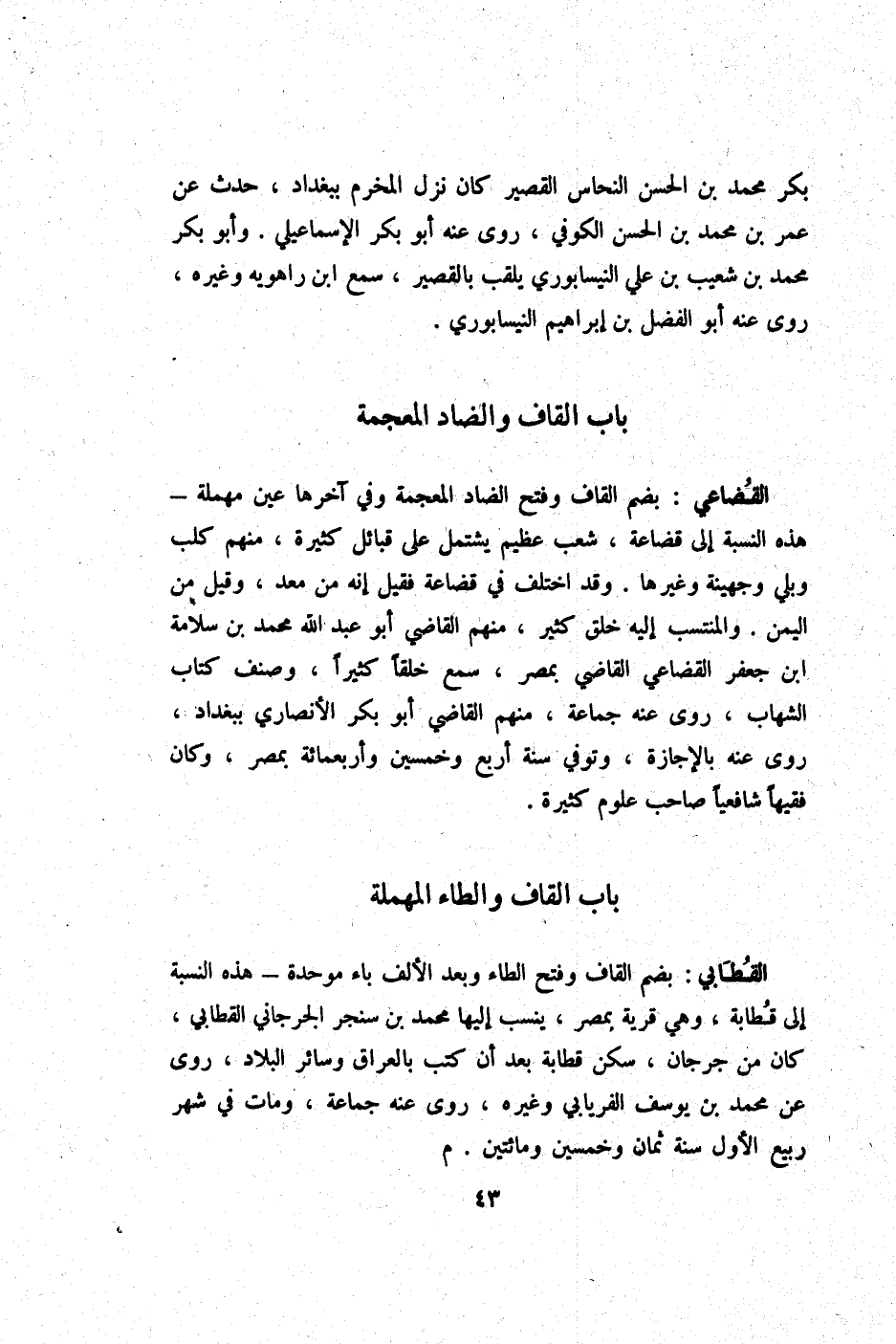 الْقُضَاعِي بِضَم الْقَاف وَفتح الضَّاد الْمُعْجَمَة وَفِي آخرهَا عين مُهْملَة هَذِه النِّسْبَة إِلَى قضاعة شعب عَظِيم يشْتَمل على قبائل كَثِيرَة مِنْهُم كلب وبلي وجهينة وَغَيرهَا وَقد اخْتلف فِي قضاعة فَقيل إِنَّه من معد وَقيل من الْيمن والمنتسب إِلَيْهِ خلق كثير مِنْهُم القَاضِي أَبُو عبد الله مُحَمَّد بن سَلامَة ابْن جَعْفَر الْقُضَاعِي القَاضِي بِمصْر سمع خلقا كثيرا وصنف كتاب الشهَاب روى عَنهُ جمَاعَة مِنْهُم القَاضِي أَبُو بكر الْأنْصَارِيّ بِبَغْدَاد روى عَنهُ بِالْإِجَازَةِ وَتُوفِّي سنة أَربع وَخمسين وَأَرْبَعمِائَة بِمصْر وَكَانَ فَقِيها شافعيا صَاحب عُلُوم كَثِيرَة