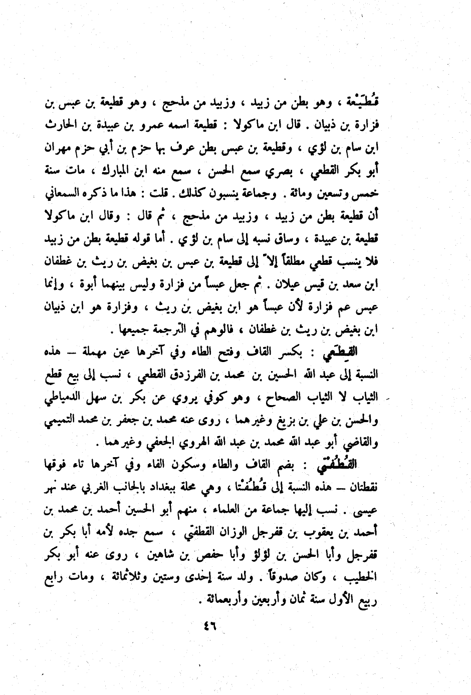 قطيعة وَهُوَ بطن من زبيد وزبيد من مذْحج وَهُوَ قطيعة بن عبس بن فَزَارَة بن ذبيان قَالَ ابْن مَاكُولَا قطيعة اسْمه عَمْرو بن عُبَيْدَة بن الْحَارِث ابْن سَام بن لؤَي وَقَطِيعَة بن عبس بطن عرف بهَا حزم بن أبي حزم مهْرَان أَبُو بكر الْقطعِي بَصرِي سمع الْحسن سمع مِنْهُ ابْن الْمُبَارك مَاتَ سنة خمس وَتِسْعين وَمِائَة وَجَمَاعَة ينسبون كَذَلِك قلت هَذَا مَا ذكره السَّمْعَانِيّ أَن قطيعة بطن من زبيد وزبيد من مذْحج ثمَّ قَالَ وَقَالَ ابْن مَاكُولَا قطيعة بن عُبَيْدَة وسَاق نسبه إِلَى سَام بن لؤَي أما قَوْله قطيعة بطن من زبيد فَلَا ينْسب قَطْعِيّ مُطلقًا إِلَّا إِلَى قطيعة بن عبس بن بغيض بن ريث بن غطفان ابْن سعد بن قيس عيلان ثمَّ جعل عبسا من فَزَارَة وَلَيْسَ بَينهمَا أبوة وَإِنَّمَا عبس عَم فَزَارَة لِأَن عبسا هُوَ ابْن بغيض بن ريث وفزارة هُوَ ابْن ذبيان ابْن بغيض بن ريث بن غطفان فالوهم فِي التَّرْجَمَة جَمِيعهَا