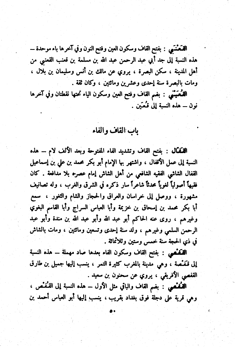 الْقفال بِفَتْح الْقَاف وَتَشْديد الْفَاء الْمَفْتُوحَة وَبعد الْألف لَام هَذِه النِّسْبَة إِلَى عمل الأقفال واشتهر بهَا الإِمَام أَبُو بكر مُحَمَّد بن عَليّ بن إِسْمَاعِيل الْقفال الشَّاشِي الْفَقِيه الشَّافِعِي من أهل الشاش إِمَام عصره بِلَا مدافعة كَانَ فَقِيها أصوليا لغويا مُحدثا شَاعِرًا سَار ذكره فِي الشرق والغرب وَله تصانيف مَشْهُورَة وَوصل إِلَى خُرَاسَان وَالْعراق والحجاز وَالشَّام والثغور سمع أَبَا بكر مُحَمَّد بن إِسْحَاق بن خُزَيْمَة وَأَبا الْعَبَّاس السراج وَأَبا الْقَاسِم الْبَغَوِيّ وَغَيرهم روى عَنهُ الْحَاكِم أَبُو عبد الله وَأَبُو عبد الله بن مندة وَأَبُو عبد الرَّحْمَن السّلمِيّ وَغَيرهم ولد سنة إِحْدَى وَتِسْعين وَمِائَتَيْنِ وَمَات بالشاش فِي ذِي الْحجَّة سنة خمس وَسِتِّينَ وثلاثمائة