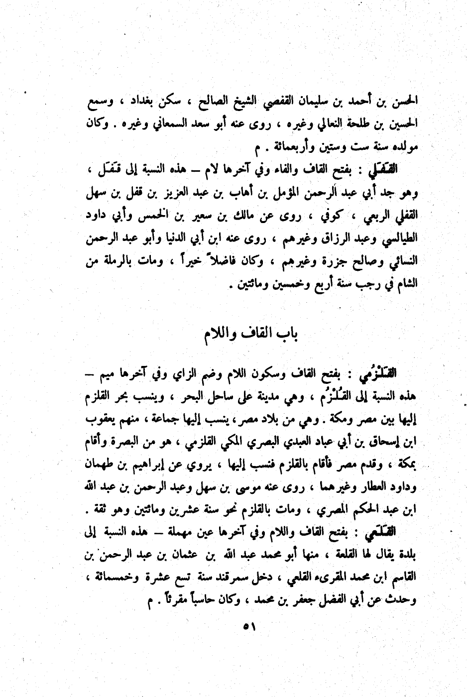 القفلي بِفَتْح الْقَاف وَالْفَاء وَفِي آخرهَا لَام هَذِه النِّسْبَة إِلَى قفل وَهُوَ جد أبي عبد الرَّحْمَن المؤمل بن أهاب بن عبد الْعَزِيز بن قفل بن سهل القفلي الربعِي كُوفِي روى عَن مَالك بن سعير بن الْخمس وَأبي دَاوُد الطياليسي وَعبد الرَّزَّاق وَغَيرهم روى عَنهُ ابْن أبي الدُّنْيَا وَأَبُو عبد الرَّحْمَن النَّسَائِيّ وَصَالح جزرة وَغَيرهم وَكَانَ فَاضلا خيرا وَمَات بالرملة من الشَّام فِي رَجَب سنة أَربع وَخمسين وَمِائَتَيْنِ