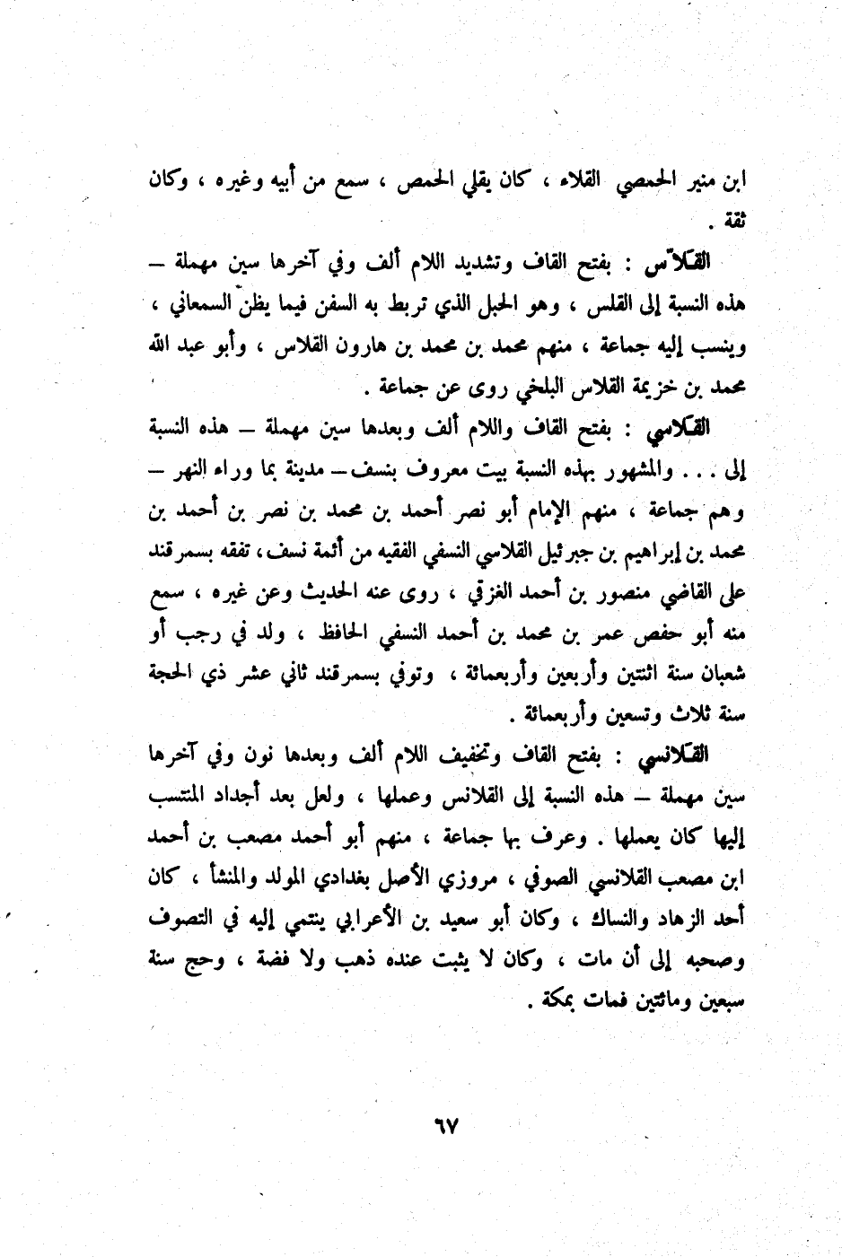القلاسي بِفَتْح الْقَاف وَاللَّام ألف وَبعدهَا سين مُهْملَة هَذِه النِّسْبَة إِلَى ... وَالْمَشْهُور بِهَذِهِ النِّسْبَة بَيت مَعْرُوف بنسف مَدِينَة بِمَا وَرَاء النَّهر وهم جمَاعَة مِنْهُم الإِمَام أَبُو نصر أَحْمد بن مُحَمَّد بن نصر بن أَحْمد بن مُحَمَّد بن إِبْرَاهِيم بن جبرئيل القلاسي النَّسَفِيّ الْفَقِيه من أَئِمَّة نسف تفقه بسمرقند على القَاضِي مَنْصُور بن أَحْمد الغزقي روى عَنهُ الحَدِيث وَعَن غَيره سمع مِنْهُ أَبُو حَفْص عمر بن مُحَمَّد بن أَحْمد النَّسَفِيّ الْحَافِظ ولد فِي رَجَب أَو شعْبَان سنة اثْنَتَيْنِ وَأَرْبَعين وَأَرْبَعمِائَة وَتُوفِّي بسمرقند ثَانِي عشر ذِي الْحجَّة سنة ثَلَاث وَتِسْعين وَأَرْبَعمِائَة