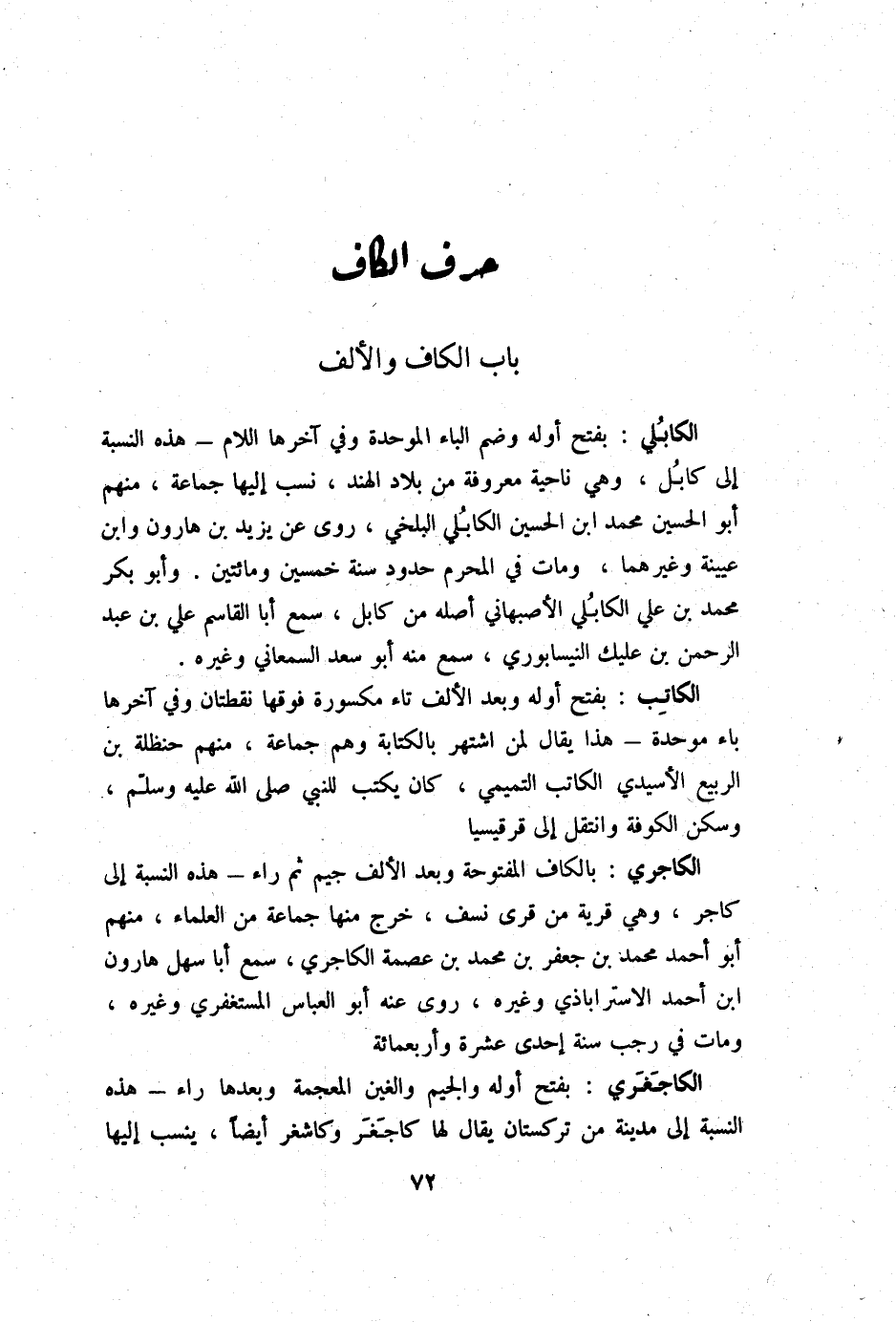 الكابلي بِفَتْح أَوله وَضم الْبَاء الْمُوَحدَة وَفِي آخرهَا اللَّام هَذ النِّسْبَة إِلَى كابل وَهِي نَاحيَة مَعْرُوفَة من بِلَاد الْهِنْد نسب إِلَيْهَا جمَاعَة مِنْهُم أَبُو الْحُسَيْن مُحَمَّد ابْن الْحُسَيْن الكابلي الْبَلْخِي روى عَن يزِيد بن هَارُون وَابْن عُيَيْنَة وَغَيرهمَا وَمَات فِي الْمحرم حُدُود سنة خمسين وَمِائَتَيْنِ وَأَبُو بكر مُحَمَّد بن عَليّ الكابلي الْأَصْبَهَانِيّ أَصله من كابل سمع أَبَا الْقَاسِم عَليّ بن عبد الرَّحْمَن بن عَلَيْك النَّيْسَابُورِي سمع مِنْهُ أَبُو سعد السَّمْعَانِيّ وَغَيره