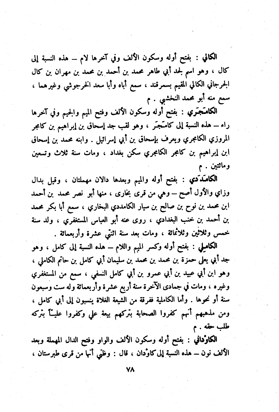 الكاملي بِفَتْح أَوله وَكسر الْمِيم وَاللَّام هَذِه النِّسْبَة إِلَى كَامِل وَهُوَ جد أبي يعلى حَمْزَة بن مُحَمَّد بن مُحَمَّد بن سُلَيْمَان أبي كَامِل بن حَاتِم الكاملي وَهُوَ ابْن أبي عبيد بن أبي عَمْرو بن أبي كَامِل النَّسَفِيّ سمع من المستغفري وَغَيره وَمَات فِي جُمَادَى الْآخِرَه سنة أَربع عشرَة وَأَرْبَعمِائَة وَله سِتّ وَسَبْعُونَ سنة أَو نَحْوهَا وَأما الكاملية ففرقة من الشِّيعَة الغلاة ينسبون إِلَى أبي كَامِل وَمن مَذْهَبهم أَنهم كفرُوا الصَّحَابَة بتركهم بيعَة عَليّ وَكَفرُوا عليا بِتَرْكِهِ طلب حَقه م