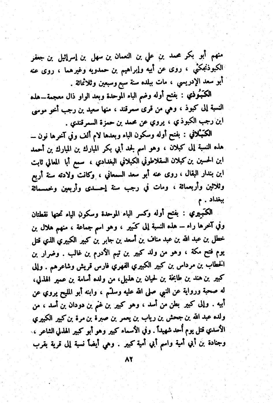 الكبيري بِفَتْح أَوله وَكسر الْبَاء الموحده وَسُكُون الْيَاء تحتهَا نقطتان وَفِي آخرهَا رَاء هَذِه النِّسْبَة إِلَى كَبِير وَهُوَ اسْم جمَاعَة مِنْهُم هِلَال بن خطل بن عبد الله بن عبد منَاف بن أسعد بن جَابر بن كَبِير الكبيري الَّذِي قتل يَوْم فتح مَكَّة وَهُوَ من ولد كَبِير بن تيم الأدرم بن غَالب وَضِرَار بن الْخطاب بن مرداس بن كَبِير الكبيري الفِهري فَارس قُرَيْش وشاعرهم وَإِلَى كَبِير بن هِنْد بن طابخة بن لحيان بن هُذَيْل من وَلَده أُسَامَة بن عُمَيْر الْهُذلِيّ لَهُ صُحْبَة وَرِوَايَة عَن النَّبِي صلى الله عَلَيْهِ وَسلم وَابْنه أَبُو الْمليح يروي عَن أَبِيه وَإِلَى كَبِير بطن من أَسد وَهُوَ كَبِير بن غنم بن دودان بن أَسد من وَلَده عبد الله بن جحش بن رياب بن يعمر بن صبرَة بن مرّة بن كَبِير الكبيري الْأَسدي قتل يَوْم أحد شَهِيدا وَفِي الْأَسْمَاء كَبِير وَهُوَ أَبُو كَبِير الْهُذلِيّ الشَّاعِر وجنادة بن أبي أُميَّة وَاسم أبي امية كَبِير وَهِي أَيْضا نِسْبَة إِلَى قَرْيَة بِقرب