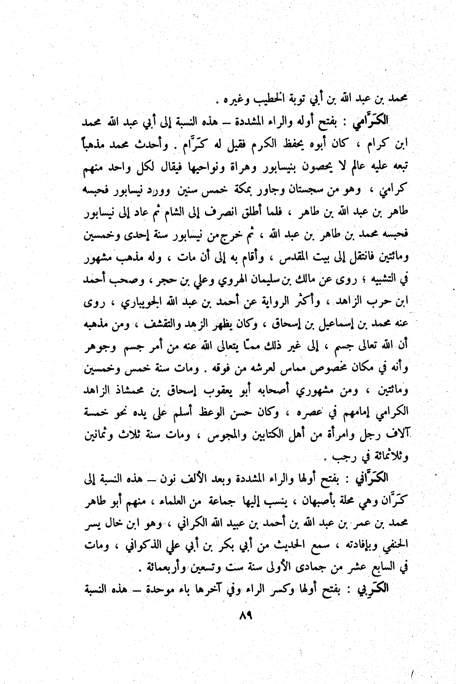 الكرامي بِفَتْح أَوله وَالرَّاء الْمُشَدّدَة هَذِه النِّسْبَة إِلَى أبي عبد الله مُحَمَّد ابْن كرام كَانَ أَبوهُ يحفظ الْكَرم فَقيل لَهُ كرام وأحدث مُحَمَّد مذهبا تبعه عَلَيْهِ عَالم لَا يُحصونَ بنيسابور وهراة ونواحيها فَيُقَال لكل وَاحِد مِنْهُم كرامي وَهُوَ من سجستان وجاور بِمَكَّة خمس سِنِين وَورد نيسابور فحبسه طَاهِر بن عبد الله بن طَاهِر فَلَمَّا أطلق انْصَرف إِلَى الشَّام ثمَّ عَاد إِلَى نيسابور فحبسه مُحَمَّد بن طَاهِر بن عبد الله ثمَّ خرج من نيسابور سنة إِحْدَى وَخمسين وَمِائَتَيْنِ فانتقل إِلَى بَيت الْمُقَدّس وَأقَام بِهِ إِلَى أَن مَاتَ وَله مَذْهَب مَشْهُور فِي التَّشْبِيه روى عَن مَالك بن سُلَيْمَان الْهَرَوِيّ وَعلي بن حجر وَصَحب أَحْمد ابْن حَرْب الزَّاهِد وَأكْثر الرِّوَايَة عَن أَحْمد بن عبد الله الجويباري روى عَنهُ مُحَمَّد بن إِسْمَاعِيل بن إِسْحَاق وَكَانَ يظْهر الزّهْد والتقشف وَمن مذْهبه أَن الله تَعَالَى جسم إِلَى غير ذَلِك مِمَّا يتعالى الله عَنهُ من أَمر جسم وجوهر وَأَنه فِي مَكَان مَخْصُوص مماس لعرشه من فَوْقه وَمَات سنة خمس وَخمسين وَمِائَتَيْنِ وَمن مشهوري أَصْحَابه أَبُو يَعْقُوب إِسْحَاق بن محمشاذ الزَّاهِد الكرامي إمَامهمْ فِي عصره وَكَانَ حسن الْوَعْظ أسلم على يَده نَحْو خَمْسَة آلَاف رجل وَامْرَأَة من أهل الْكِتَابَيْنِ وَالْمَجُوس وَمَات سنة ثَلَاث وَثَمَانِينَ وثلاثمائة فِي رَجَب