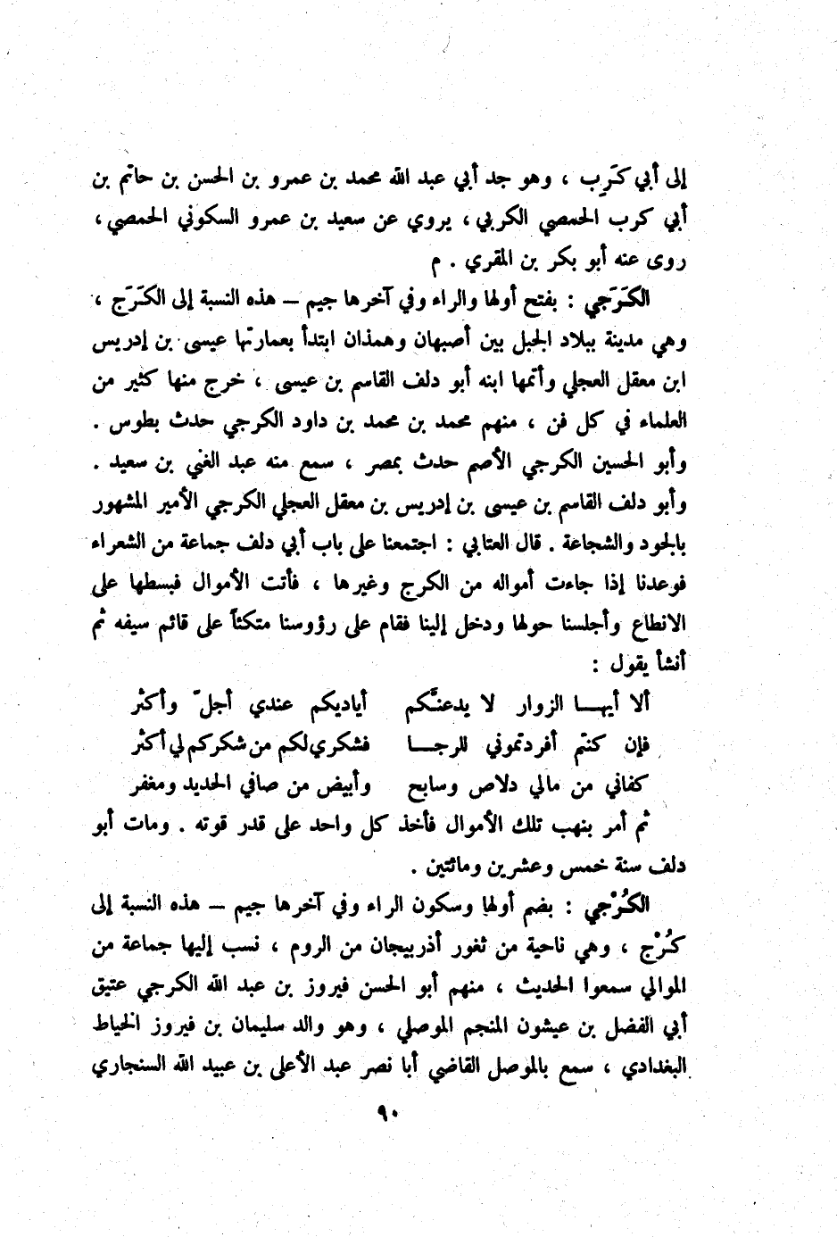 الكرجي بِفَتْح أَولهَا وَالرَّاء وَفِي آخرهَا جِيم هَذِه النِّسْبَة إِلَى الكرج وَهِي مَدِينَة بِبِلَاد الْجَبَل بَين أَصْبَهَان وهمذان ابْتَدَأَ بعمارتها عِيسَى بن إِدْرِيس ابْن معقل الْعجلِيّ وأتمها ابْنه أَبُو دلف الْقَاسِم بن عِيسَى خرج مِنْهَا كثير من الْعلمَاء فِي كل فن مِنْهُم مُحَمَّد بن مُحَمَّد بن دَاوُد الكرجي حدث بطوس وَأَبُو الْحُسَيْن الكرجي الْأَصَم حدث بِمصْر سمع مِنْهُ عبد الْغَنِيّ بن سعيد وَأَبُو دلف الْقَاسِم بن عِيسَى بن إِدْرِيس بن معقل الْعجلِيّ الكرجي الْأَمِير الْمَشْهُور بالجود والشجاعة قَالَ العتابي اجْتَمَعنَا على بَاب أبي دلف جمَاعَة من الشُّعَرَاء فوعدنا إِذا جَاءَت أَمْوَاله من الكرج وَغَيرهَا فَأَتَت الاموال فبسطها على الانطاع وأجلسنا حولهَا وَدخل إِلَيْنَا فَقَامَ على رؤوسنا مُتكئا على قَائِم سَيْفه ثمَّ أنشأ يَقُول