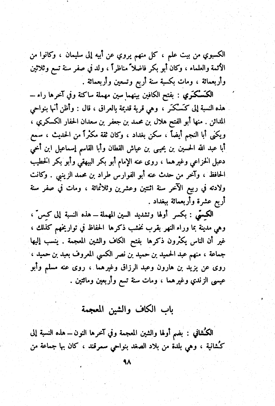 الكسكري بِفَتْح الكافين بَينهمَا سين مُهْملَة سَاكِنة وَفِي آخرهَا رَاء هَذِه النِّسْبَة إِلَى كسكر وَهِي قَرْيَة قديمَة بالعراق قَالَ وأظن أَنَّهَا بنواحي الْمَدَائِن مِنْهَا أَبُو الْفَتْح هِلَال بن مُحَمَّد بن جَعْفَر بن سَعْدَان الحفار الكسكري ويكنى أَبَا النَّجْم أَيْضا سكن بَغْدَاد وَكَانَ ثِقَة مكثرا من الحَدِيث سمع أَبَا عبد الله الْحُسَيْن بن يحيى بن عَيَّاش الْقطَّان وَأَبا الْقَاسِم إِسْمَاعِيل ابْن أخي دعبل الْخُزَاعِيّ وَغَيرهمَا روى عَنهُ الإِمَام أَبُو بكر الْبَيْهَقِيّ وَأَبُو بكر الْخَطِيب الْحَافِظ وَآخر من حدث عَنهُ أَبُو الفوارس طراد بن مُحَمَّد الزَّيْنَبِي وَكَانَت وِلَادَته فِي ربيع الآخر سنة اثْنَتَيْنِ وَعشْرين وثلاثمائة وَمَات فِي صفر سنة ارْبَعْ عشرَة وَأَرْبَعمِائَة بِبَغْدَاد
