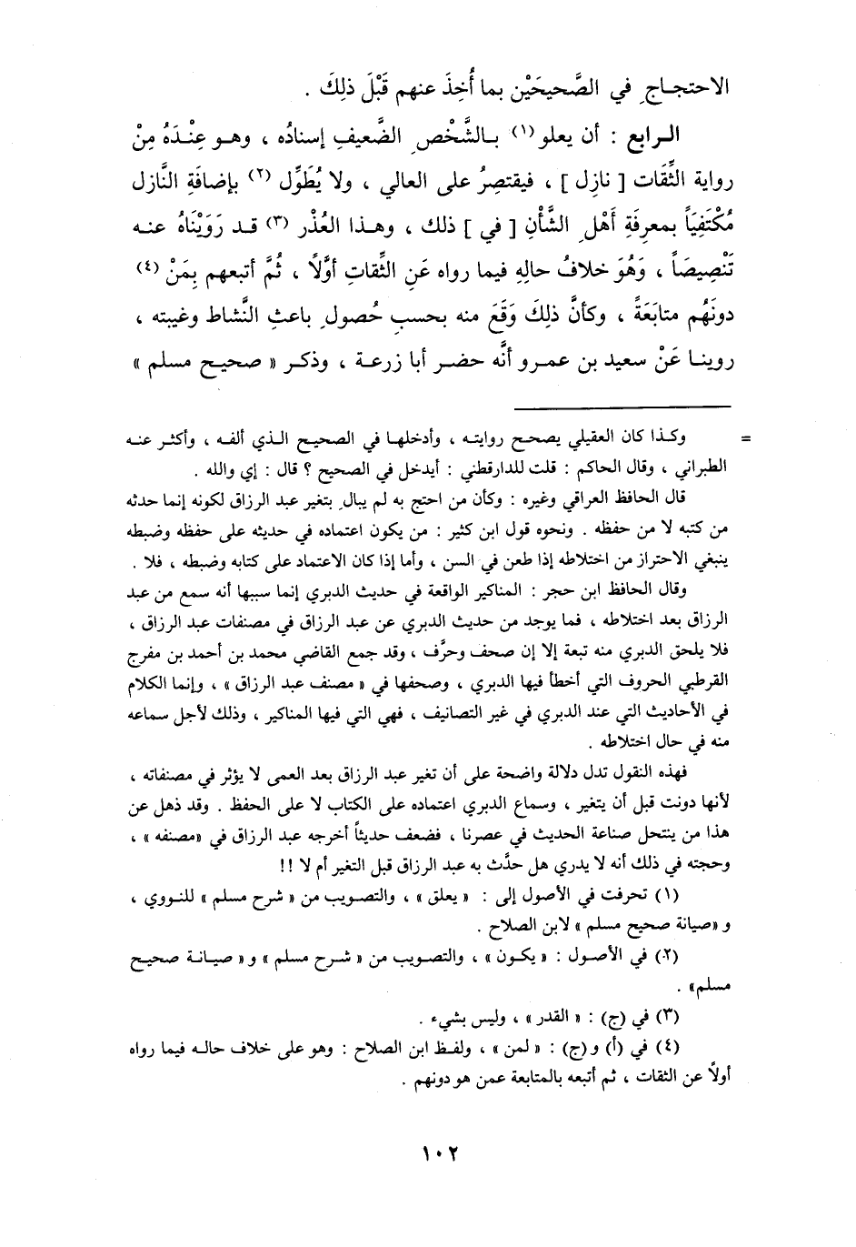 فهذه النقول تدل دلالة واضحة على أن تغير عبد الرزاق بعد العمى لا يؤثر في مصنفاته، لأنها دونت قبل أن يتغير، وسماع الدبري اعتماده على الكتاب لا على الحفظ. وقد ذهل عن هذا من ينتحل صناعة الحديث في عصرنا، فضعف حديثاًً أخرجه عبد الرزاق في " مصنفه "، وحجته في ذلك أنَّه لا يدري هل حدَّث به عبد الرزاق قبل التغير أم لا!!