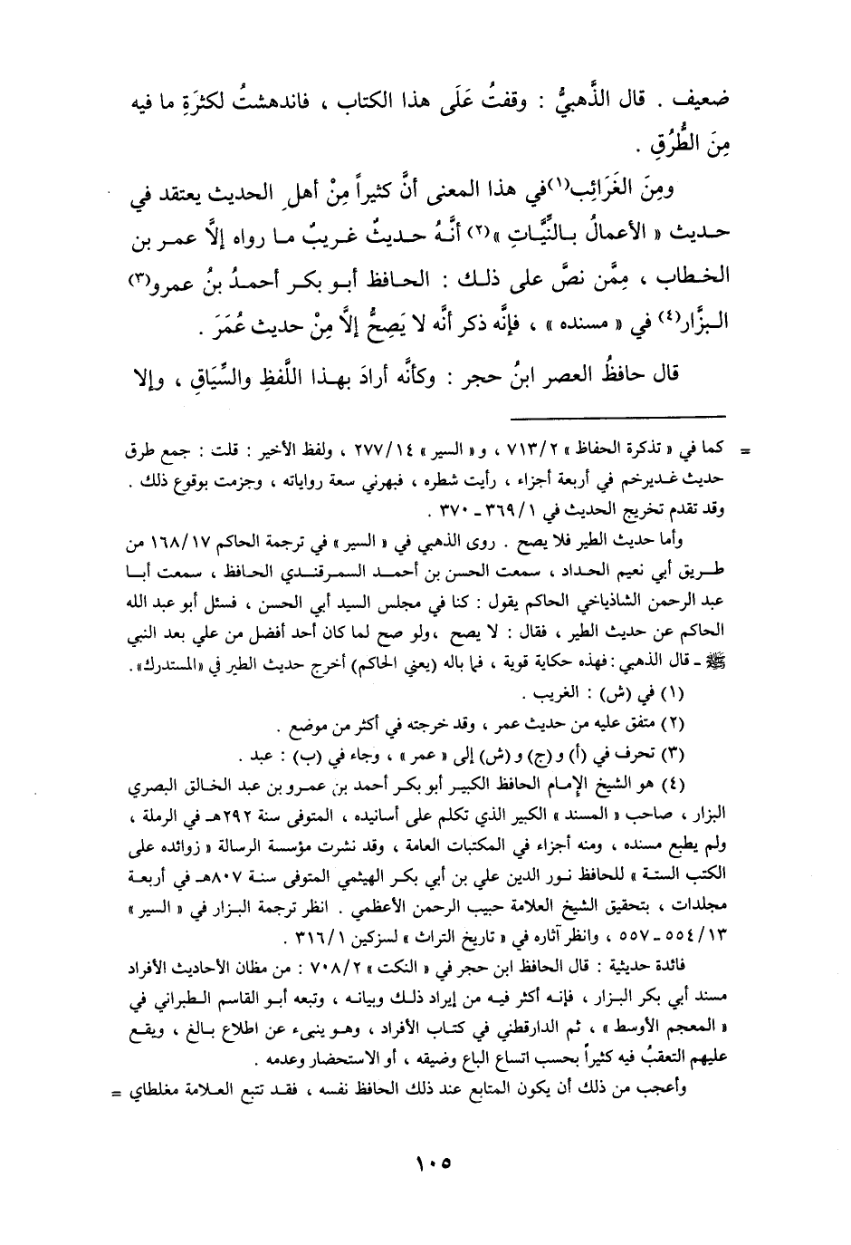ومِن الغَرَائِب (¬1) في هذا المعنى أنَّ كثيراً منْ أهلِ الحديث يعتقد في حديث " الأعمالُ بالنِّيَّاتِ " (¬2) أنَّهُ حديث غريبٌ ما رواه إلاَّ عمر بن الخطاب، مِمَّن نصَّ على ذلك: الحافظ أبو بكر أحمدُ بنُ عمرو (¬3) البزَّار (¬4) في " مسنده "، فإنَّه ذكر أنه لا يَصِحُّ إلا مِنْ حديث عُمرَ.