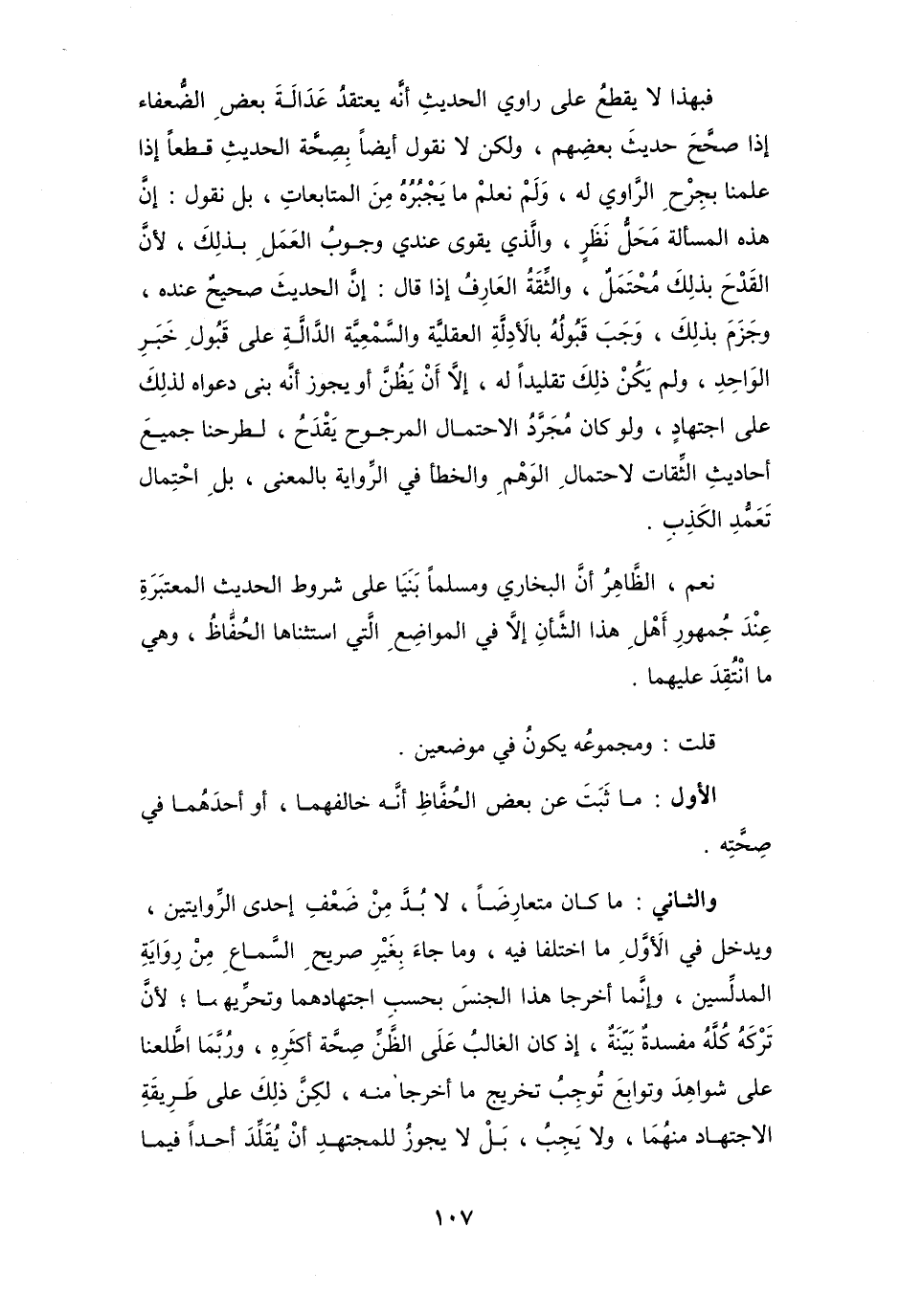 فبهذا لا يقطعُ على راوي الحديثِ أنَّه يعتقدُ عَدَالَةَ بعضِ الضُّعفاء إذا صحَّحَ حديثَ بعضِهم، ولكن لا نقول أيضاً بِصحَّة الحديثِ قطعاً إذا علمنا بجِرْحِ الرَّاوي له، وَلَمْ نعلمْ ما يَجْبُرُهُ مِنَ المتابعاتِ، بل نقول: إنَّ هذه المسألة مَحَلُّ نَظَرٍ، والذي يقوى عندي وجوبُ العَمَلِ بذلِكَ، لأنَّ القَدْحَ بذلِكَ مُحْتَمَلٌ، والثِّقَةُ العَارِفُ إذا قال: إنَّ الحديثَ صحيحٌ عنده، وجَزَمَ بذلِكَ، وَجَبَ قَبولُهُ بالَأدِلَّةِ العقليَّة والسَّمْعِيَّة الدالَّةِ على قَبُولِ خَبَر الوَاحِدِ، ولم يَكُنْ ذلِك تقليداً له، إلاَّ أَنْ يَظُنَّ أو يجوز أنَّه بنى دعواه لذلكَ على اجتهادٍ، ولو كان مُجَرَّدُ الاحتمال المرجوح يَقْدَحُ، لطرحنا جميعَ أحاديثِ الثِّقات لاحتمالِ الوَهْمِ والخطأ في الرواية بالمعنى، بلِ احْتِمال تَعَمُّدِ الكَذِبِ.