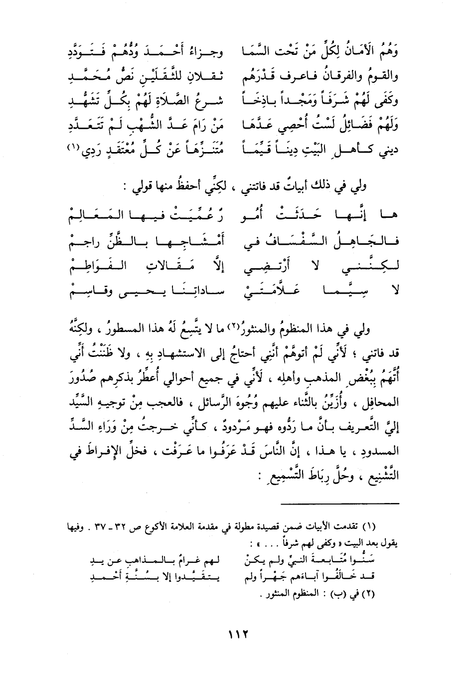 ولي في هذا المنظومُ والمنثورُ (¬2) ما لا يتَّسِعُ لهُ هذا المسطورُ، ولكنَّهُ قد فاتني؛ لَأنَي لَمْ أتوهَّمْ أنَّني أحتاج إلى الاستشهادِ بِهِ، ولا ظَنَنْتُ أَنِّي أُتَّهَمُ بِبُغض المذهب وأهلِه، لأنِّي في جميع أحوالي أعطرُ بذكرِهم صُدُورَ المحافِل، وأُزَيَنُ بالَثَّناء عليهم وُجُوهَ الرسائل، فالعجب منْ توجيهِ السيِّد إليَّ التَّعريف بأنَّ ما رَدُّوه فهو مَرْدودٌ، كأنِّي خرجتُ مِنْ وَرَاءِ السَّدِّ المسدودِ، يا هذا، إنَّ النَّاسَ قَدْ عَرَفُوا ما عَرَفْت، فخلِّ الِإفراطَ في التَّشْنِيع، وحُلَّ رِبَاطَ التَّسْمِيعِ: