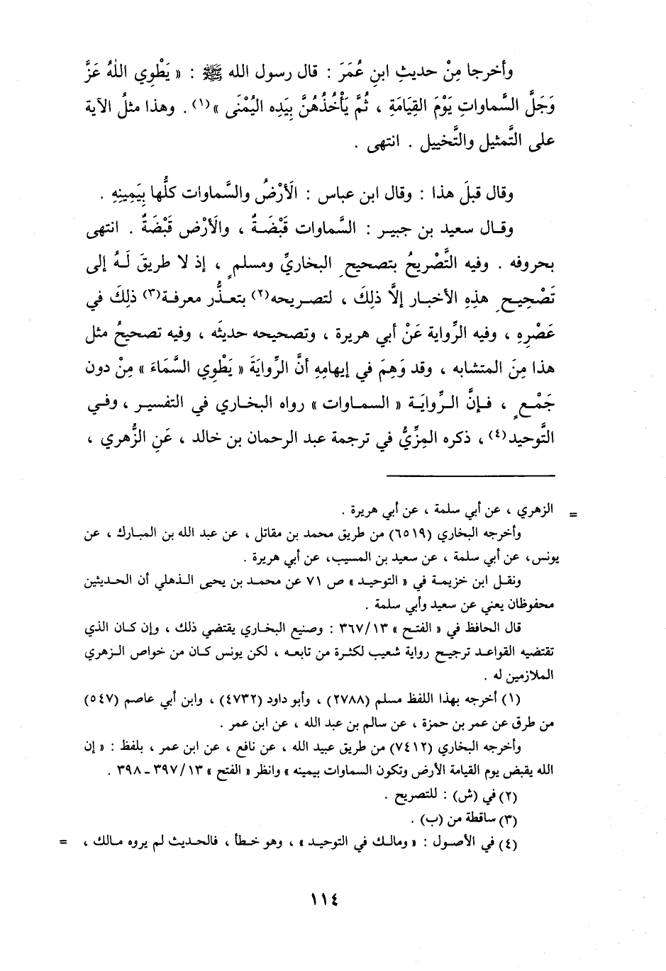 وقال سعيد بن جبير: السَّماوات قَبْضَة، والأرْض قَبْضَةٌ. انتهى بحروفه. وفيه التَّصْريحُ بتصحيحِ البخاريِّ ومسلمٍ، إذ لا طريقَ لَهُ إلى تَصْحِيحِ هذِهِ الأخبار إلاَّ ذلِكَ، لتصريحه (¬2) بتعذُّر معرفة (¬3) ذلِكَ في عَصْرِه، وفيه الرِّواية عَنْ أبي هريرة، وتصحيحه حديثَه، وفيه تصحيحُ مثل هذا منَ المتشابه، وقد وَهِمَ في إيهامِهِ أنَّ الرِّوايَةَ " يطْوِي السمَاءَ " مِنْ دون جَمعٍ، فإنَّ الرِّوايَة " السماوات " رواه البخاري في التفسير، وفي التَّوحيد (¬4)، ذكره المزِّيُّ في ترجمة عبد الرحمان بن خالد، عنِ الزُّهري،