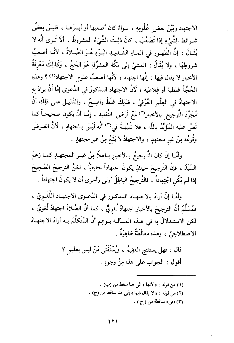 وأمَّا إنْ أرادَ بالاجتهاد المذكور في الدعوى الاجتهادَ اللغَوِيٌ، فمُسَلمٌ أنَّ الترجيحَ بالأخبارِ اجتهادٌ لُغَوِيٌّ، كما أن الصَّلاةَ اجتهادٌ لُغوي، لكن الاستدلال به في هذه المسألة يوهِم أن المُتَكلمَ به أراد الاجتهادَ الاصطلاحِي، وهذه مغالطَةٌ ظاهِرَة.