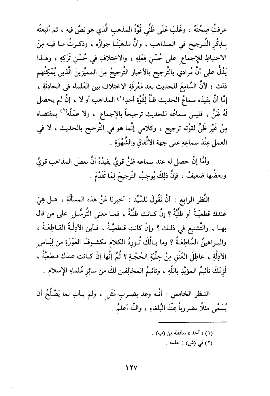 عرفتُ صِحَّتهُ، وغَلَبَ عَلَى ظَنِّي قوَّةُ المذهبِ الذي هو نصَّ فيه، ثم أتبعتُه بِذِكْرِ التَّرجيح في المذاهب، وأنَّ مذهبنا جوازه، وذكرتٌ ما فيه منَ الاحتياط للإجماعِ على حُسْنِ فِعْلِهِ، والاختلافِ في حُسْنِ تَرْكهِ، وهذا يدُلُّ على أنَّ مُرادي بالترجيح بالأخبار الترجيحُ مِنَ المميِّزين الذين يُمْكِنُهم ذلك، لأنَّ السَّامِعَ للحديث بعد معْرفَةِ الاختلاف بين العُلماء في الحادِثَةِ، إمَّا أنْ يفيدَه سماعُ الحديث ظنَّاً لقوَّة أحدِ (¬1) المذاهب أو لا، إنْ لم يحصل لَهُ ظَنٌّ، فليس سماعُه للحديث ترجيحاً بالإجماعِ، ولا عمَلُه (¬2) بمقتضاه مِنْ غَيْرِ ظَنٍّ لقوَّته ترجيح، وكلامي إنَّما هو في التَّرجيح بالحديث، لا في العمل عِنْدَ سماعِهِ على جهة الاتِّفاقِ والشَّهْوة.