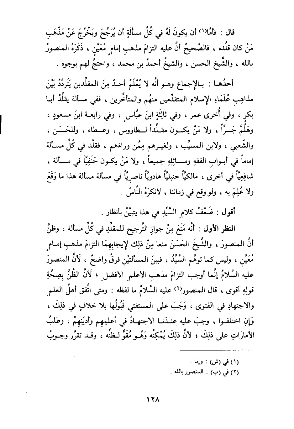النظر الأول: أنَّه مَنَعَ مِنْ جوازِ التَّرجيح للمقلِّدِ في كُلِّ مسألة، وظنَّ أن المنصور، والشَّيخ الحَسَنَ منعا مِنْ ذلك لإيجابِهِمَا التزامَ مذهبِ إمامٍ مُعَيَّنٍ، وليس كما توهَّم السيدُ، فبينَ المسألتيْنِ فرقٌ واضحٌ، لَأنَّ المنصور عليه السَّلامُ إنَّما أوجب التزامَ مذهبِ الأعلمِ الأفضلِ، لَأنَّ الظَّنَّ بِصِحَّةِ قولهِ أقوى، قال المنصور (¬2) عليه السَّلامُ ما لفظه: ومتى اتَّفق أهل العلمِ والاجتهادِ في الفتوى، وَجَبَ على المستفتي قَبُولها بلا خلافٍ في ذلِكَ، وَإِن اختلفوا، وجبَ عليه عندَنا الاجتهادُ في أعلمِهِم وأديَنِهِمْ، وطلبُ الأمارَاتِ على ذلِكَ، لأنَّ ذلِكَ يُمْكِنُه وَهُو مُقَوٍّ لظنِّه، وقد تقرَّر وجوبُ
