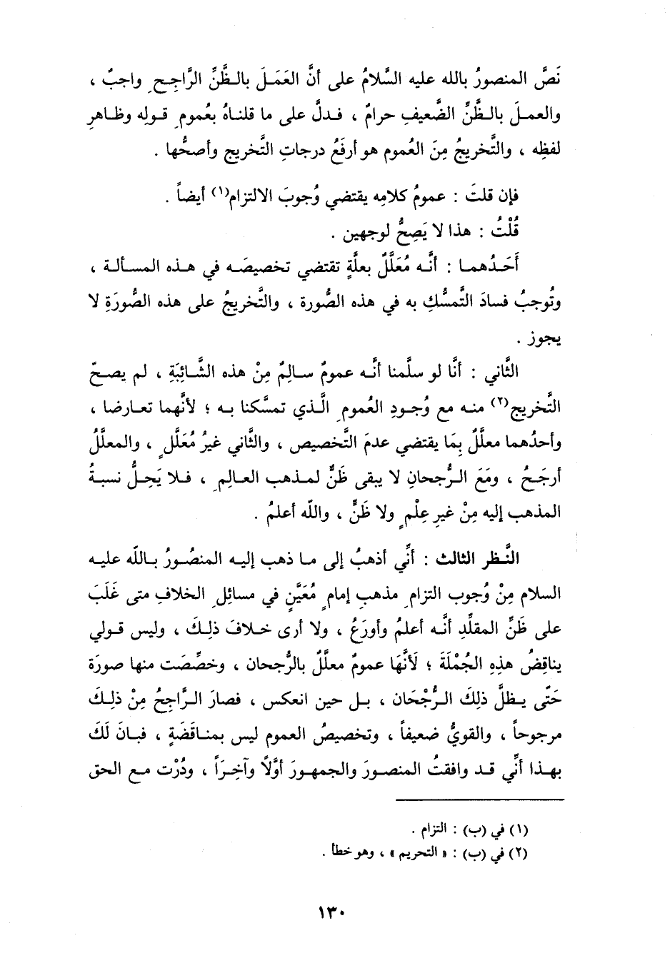 نَصَّ المنصورُ بالله عليه السلامُ على أن العَمَلَ بالظن الرَّاجِحِ واجبٌ، والعمل بالظن الضَّعيفِ حرامٌ، فدلَّ على ما قلناهُ بعُمومِ قوله وظاهرِ لفظِه، والتَّخريج مِن العموم هو أرفَعُ درجاتِ التَّخريج وأصحُّها.