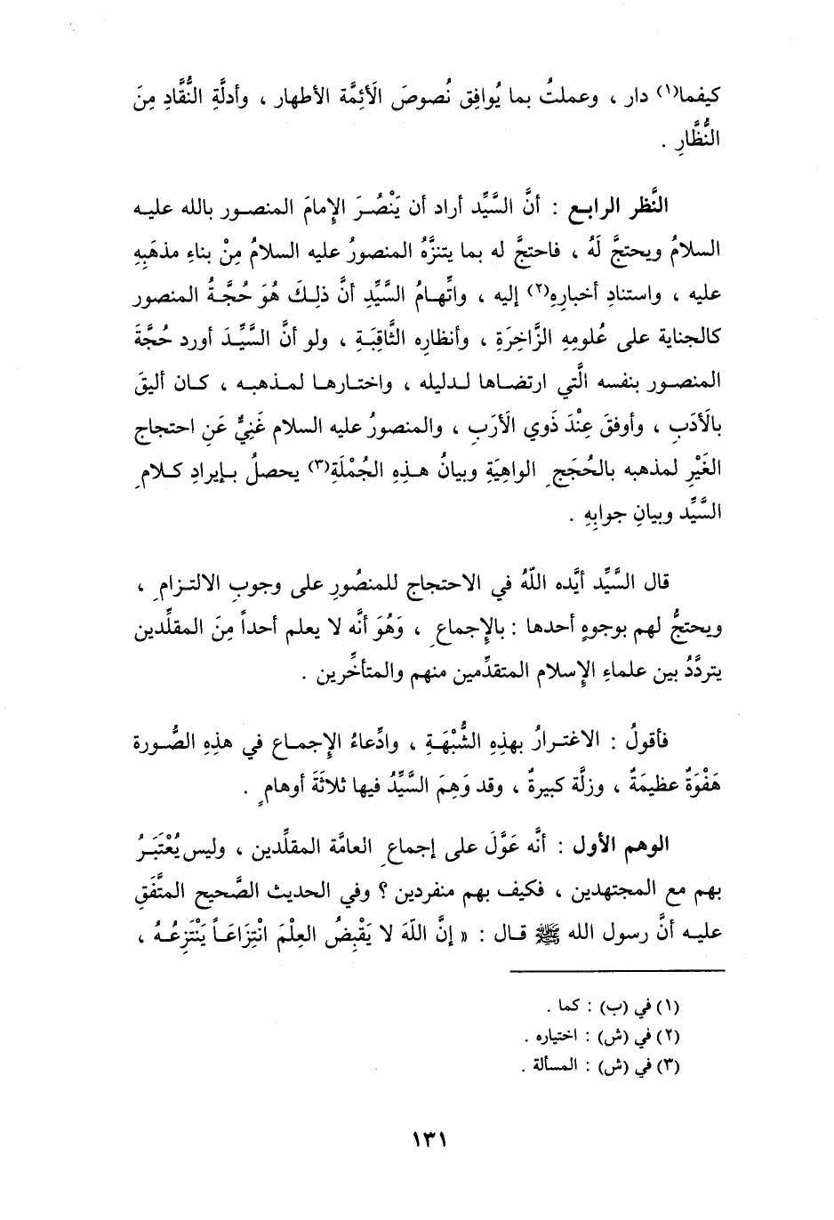بالَأدَبِ، وأوفقَ عِنْدَ ذَوي الَأرَبِ، والمنصورُ عليه السلام غَنِيٌّ عنِ احتجاج الغَيْرِ لمذهبه بالحجَجِ الواهِيَةِ وبيانُ هذِهِ الجُمْلَةِ (¬3) يحصلُ بإيراد كلامِ السَّيِّد وبيانِ جوابه.