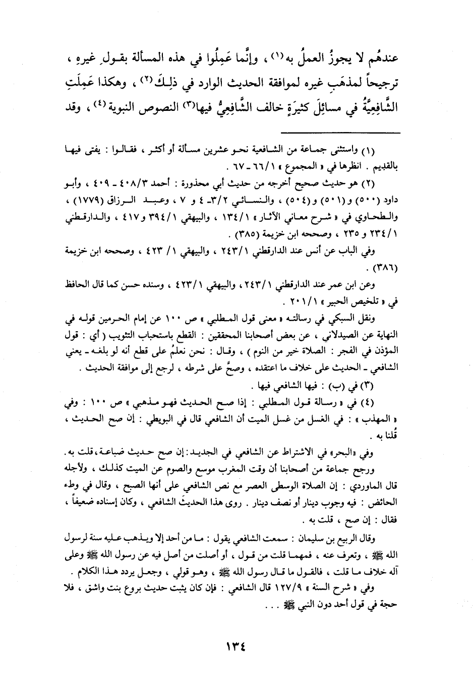 عندهُم لا يجوز العملُ به (¬1)، وإنَّما عَمِلُوا في هذه المسألة بقول غيرهِ، ترجيحاً لمذهَبِ غيره لموافقة الحديث الوارد في ذلِكَ (¬2)، وهكذا عَمِلَتِ الشَّافِعِيَّةُ في مسائِلَ كثيرَةٍ خالف الشَّافِعِيُّ فيها (¬3) النصوص النبوية (¬4)، وقد