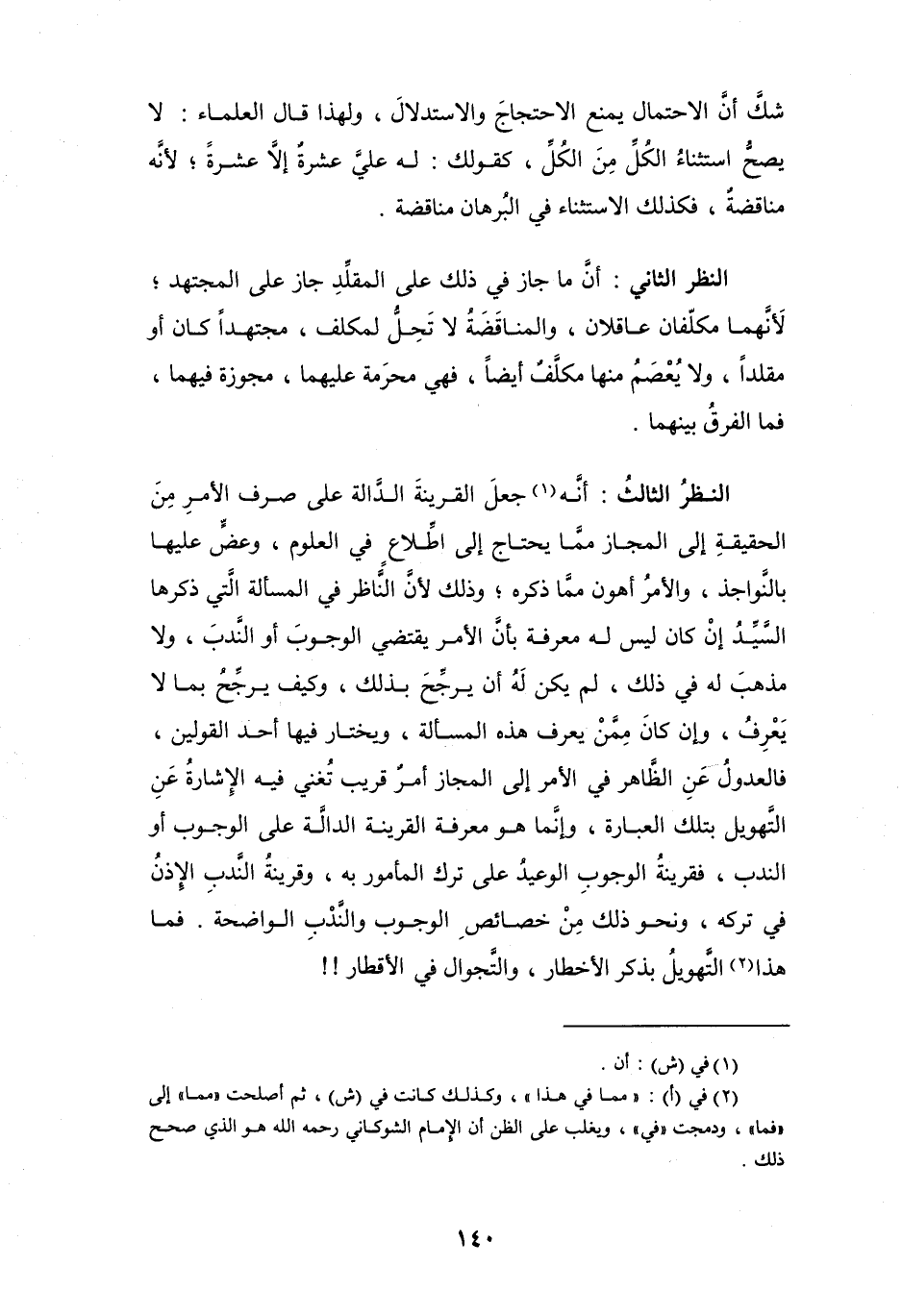 النظرُ الثالثُ: أنَّه (¬1) جعلَ القرينةَ الدَّالة على صرف الأمرِ مِنَ الحقيقةِ إلى المجاز ممَّا يحتاج إلى اطِّلاع في العلوم، وعضٍّ عليها بالنَّواجذ، والأمرُ أهون ممَّا ذكره؛ وذلك لأنَّ النَّاظر في المسألة الَّتي ذكرها السيدُ إنْ كان ليس له معرفة بأنَّ الأمر يقتضي الوجوبَ أو النَّدبَ، ولا مذهبَ له في ذلك، لم يكن لَهُ أن يرجِّحَ بذلك، وكيف يرجِّحُ بما لا يَعْرِفُ، وإن كانَ مِمَّنْ يعرف هذه المسألة، ويختار فيها أحد القولين، فالعدولُ عَنِ الظَّاهر في الأمر إلى المجاز أمرٌ قريب تُغني فيه الإشارة عَنِ التَّهويل بتلك العبارة، وإنَّما هو معرفة القرينة الدالَّة على الوجوب أو الندب، فقرينةُ الوجوبِ الوعيدُ على ترك المأمور به، وقرينةُ النَّدبِ الإذنُ في تركه، ونحو ذلك مِنْ خصائصِ الوجوب والنَّدْبِ الواضحة. فما هذا (¬2) التَّهويلُ بذكر الأخطار، والتِّجوال في الأقطار!!
