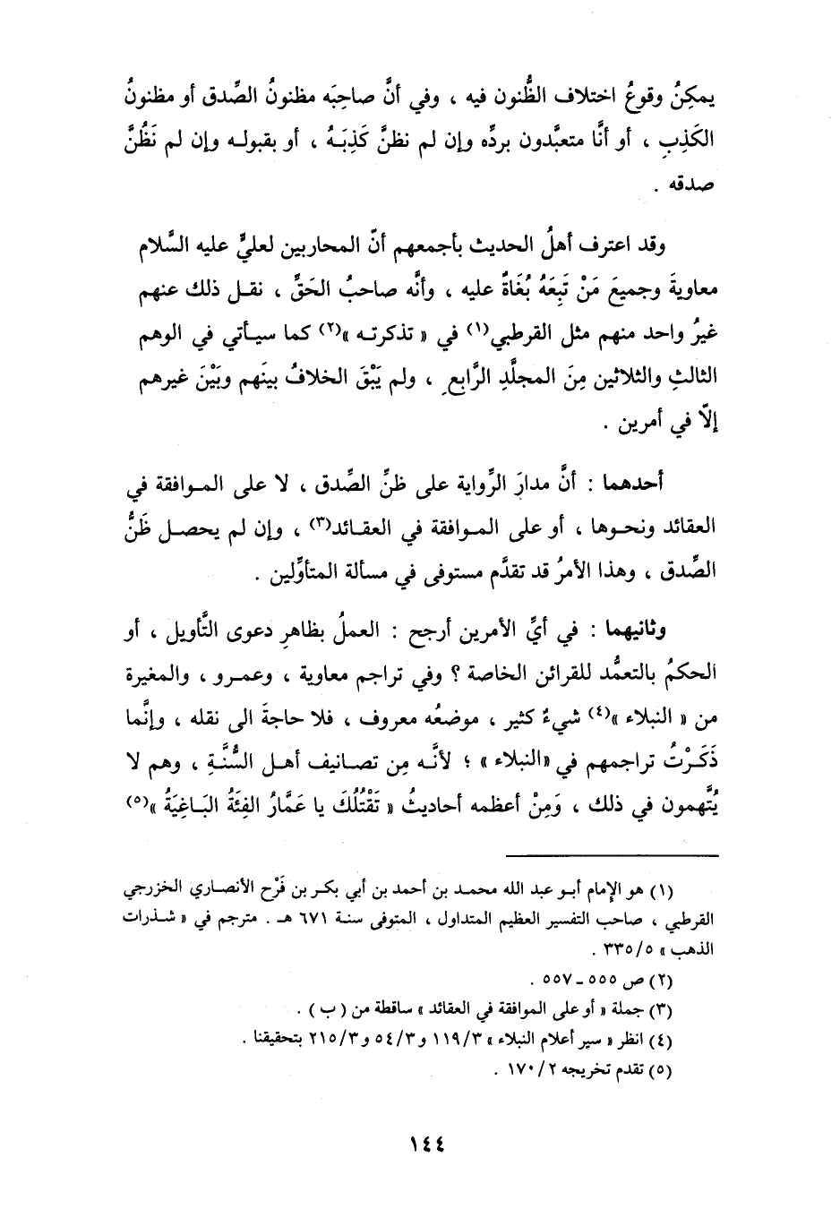 وثانيهما: في أيِّ الأمرين أرجح: العملُ بظاهرِ دعوى التَّأويل، أو الحكمُ بالتعمُّد للقرائن الخاصة؟ وفي تراجم معاوية، وعمرو، والمغيرة من " النبلاء " (¬4) شيءٌ كثير، موضعُه معروف، فلا حاجةَ إلى نقله، وإنَّما ذكَرْتُ تراجمهم في " النبلاء "، لأنَّه مِن تصانيف أهل السُّنَّةِ، وهم لا يُتَّهمون في ذلك، وَمِنْ أعظمه أحاديثُ " تَقْتُلُكَ يا عَمَّارُ الفِئَةُ البَاغِيَةُ " (¬5)
