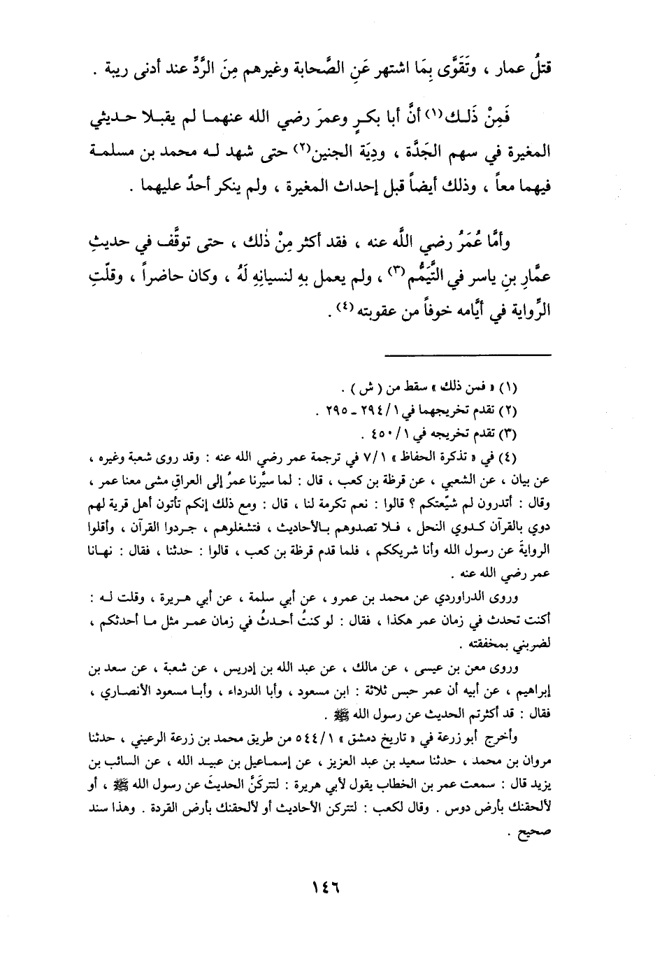 (¬4) في " تذكرة الحفاظ " 1/ 7 في ترجمة عمر رضي الله عنه: وقد روى شعبة وغيره، عن بيان، عن الشعبي، عن قرظة بن كعب، قال: لما سيَّرنا عمرُ إلى العراقِ مشى معنا عمر، وقال: أتدرون لم شيّعتكم؟ قالوا: نعم تكرمة لنا، قال: ومع ذلك إنكم تأتون أهل قرية لهم دوي بالقرآن كدوي النحل، فلا تصدوهم بالأحاديث، فتشفرهم، جردوا القرآن، وأقلوا الرواية عن رسول الله وأنا شريككم، فلمَّا قدم قرظة بن كعب، قالوا: حدثنا، فقال: نهانا عمر رضي الله عنه.