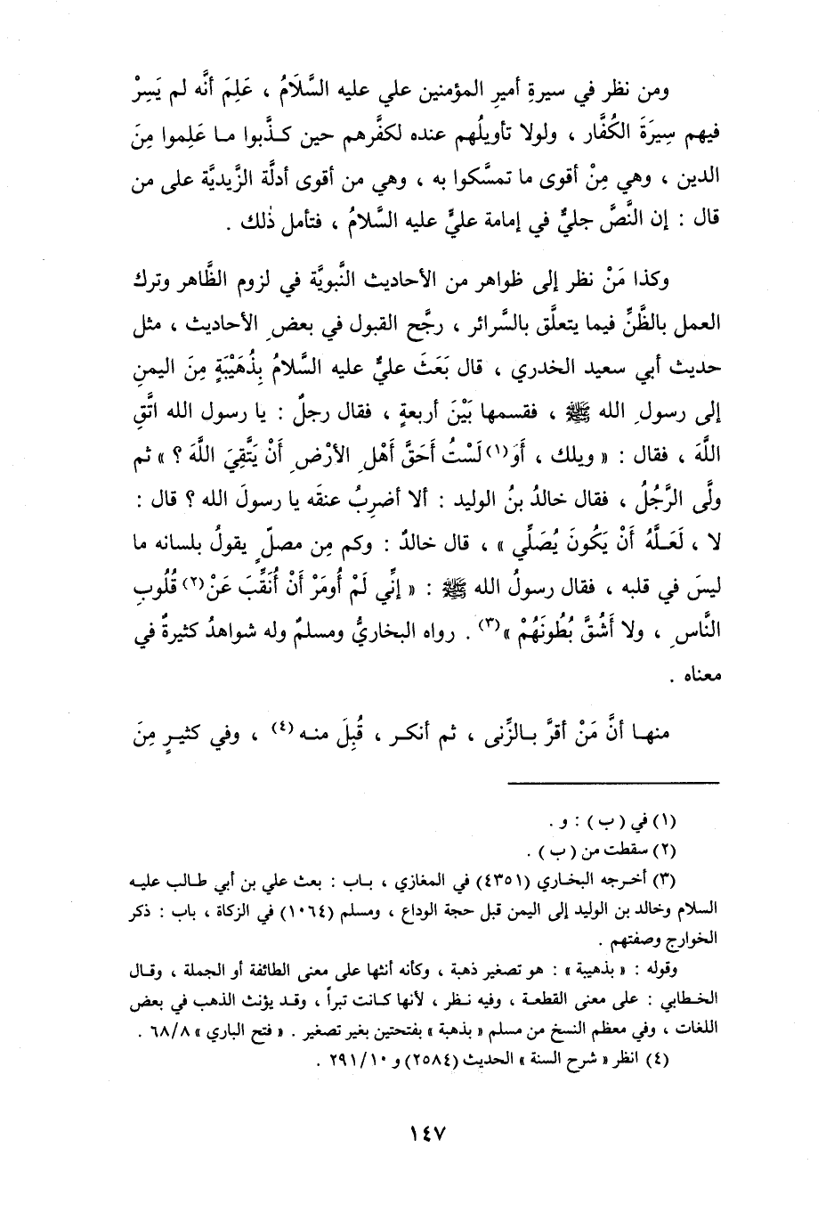 ومن نظر في سيرةِ أميرِ المؤمنين علي عليه السلام، عَلِمَ أنَّه لم يَسِرْ فيهم سِيرَةَ الكُفَّار، ولولا تأويلُهم عنده لكفَّرهم حين كذَّبوا ما عَلِموا منَ الدين، وهي مِنْ أقوى ما تمسَّكوا به، وهي من أقوى أدلَّة الزَيديَّة على من قال: إن النَّصَّ جليٌّ في إمامة عليٍّ عليه السَّلامُ، فتأمل ذلك.