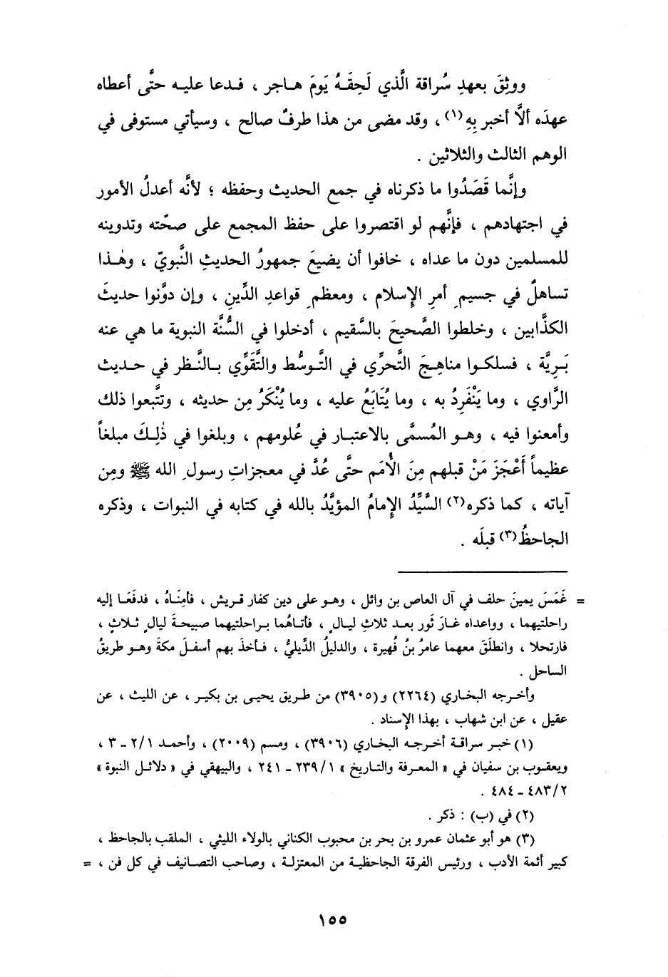 وإنَّما قَصَدُوا ما ذكرناه في جمع الحديث وحفظه، لأنَّه أعدلُ الأمور في اجتهادهم، فإنَّهم لو اقتصروا على حفظ المجمع على صحّته وتدوينه للمسلمين دون ما عداه، خافوا أن يضيعَ جمهورُ الحديثِ النَّبويّ، وهذا تساهلٌ في جسيمِ أمرِ الإسلام، ومعظم قواعدِ الدِّينِ، وإن دوَّنوا حديثَ الكذَّابين، وخلطوا الصَّحيحَ بالسَّقيم، أدخلوا في السُّنَّة النبوية ما هي عنه بَرِيَّة، فسلكوا مناهِجَ التَّحرِّي في التَّوسُّط والتَّقَوِّي بالنَّظر في حديث الرَّاوي، وما يَنْفَرِدُ به، وما يُتَابَعُ عليه، وما يُنْكَرُ مِن حديثه، وتتَّبعوا ذلك وأمعنوا فيه، وهو المُسمَّى بالاعتبار في عُلومهم، وبلغوا في ذلِكَ مبلغاً عظيماً أعْجَزَ مَنْ قبلهم مِنَ الأُمَم حتَّى عُدَّ في معجزاتِ رسولِ الله - صلى الله عليه وسلم - ومِن آياته، كما ذكره (¬2) السيد الإمامُ المؤيَّد بالله في كتابه في النبوات، وذكره الجاحظُ (¬3) قبلَه.