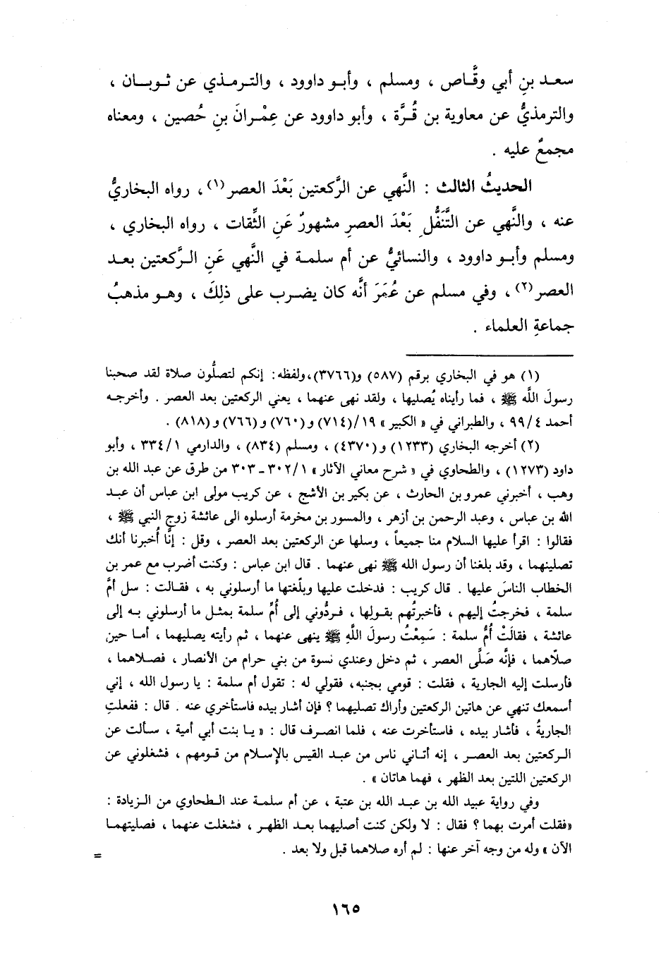 الحديثُ الثالث: النَّهي عن الركعتين بَعْدَ العصر (¬1)، رواه البخاريُّ عنه، والنَّهي عن التنَفُّلِ بَعْدَ العصرِ مشهورٌ عَنِ الثقات، رواه البخاري، ومسلم وأبو داوود، والنسائيُّ عن أم سلمة في النَّهي عَنِ الرَّكعتين بعد العصر (¬2)، وفي مسلم عن عُمَرَ أنَّه كان يضرب على ذلِكَ، وهو مذهبُ جماعةِ العلماء.