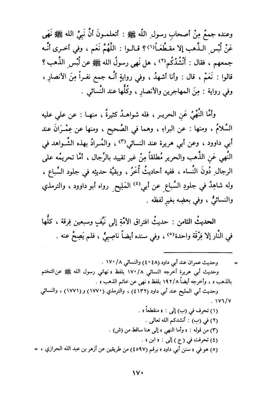 وأمَّا النَّهْيُ عَنِ الحرير، فله شواهدُ كثيرةٌ، منها: عن علي عليه السَّلامُ، ومنها: عن البراءِ، وهما في الصَّحيح، ومنها عن عِمْرَانَ عند أبي داوود، وعن أبي هريرة عند النسائي (¬3)، والمُرادُ بهذه الشَّواهد في النَّهي عَنِ الذَّهب والحرير مُطلقاً مِنْ غير تقييد بالرِّجال، أمَّا تحريمُه على الرجالِ دُونَ النِّساء، ففيه أحاديثُ أُخَرُ، وبقيَّة حديثه في جلود السِّباع، وله شاهِدٌ في جلودِ السِّباعِ عن أبي (¬4) المَلِيحِ رواه أبو داوود، والترمذي والنسائيُّ، وفي بعضِه بغيرِ لفظه.
