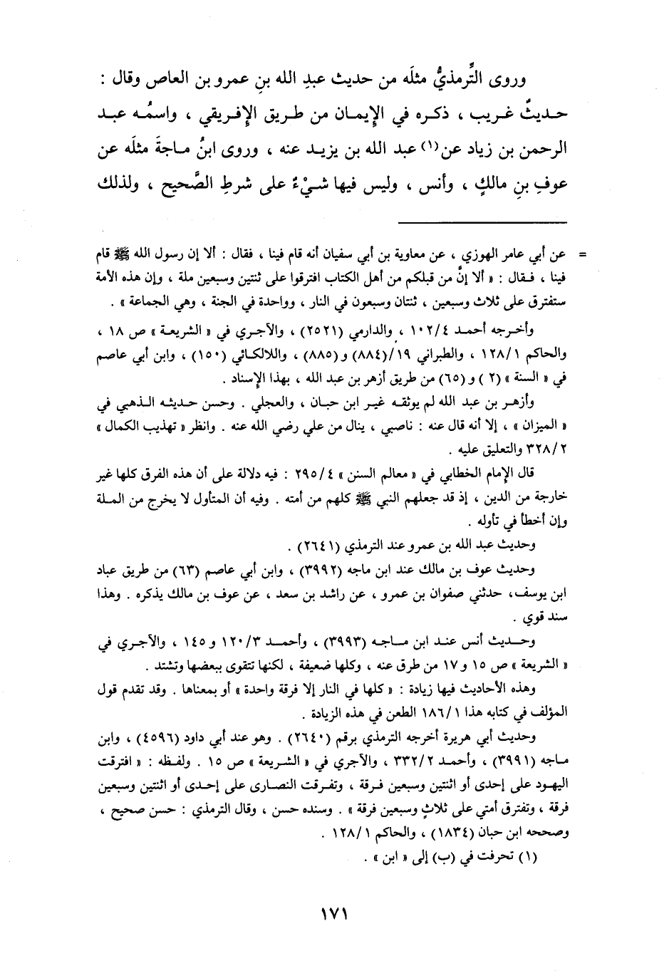 وحديث أبي هريرة أخرجه الترمذي برقم (2640). وهو عند أبي داود (4596)، وابن ماجه (3991)، وأحمد 2/ 332، والآجري في "الشريعة" ص 15. ولفظه: "افترقت اليهود على إحدى أو اثنتين وسبعين فرقة، وتفرقت النصارى على إحدى أو اثنتين وسبعين فرقة، وتفترق أمتي على ثلاث وسبعين فرقة". وسنده حسن، وقال الترمذي: حسن صحيح، وصححه ابن حبان (1834)، والحاكم 1/ 128.