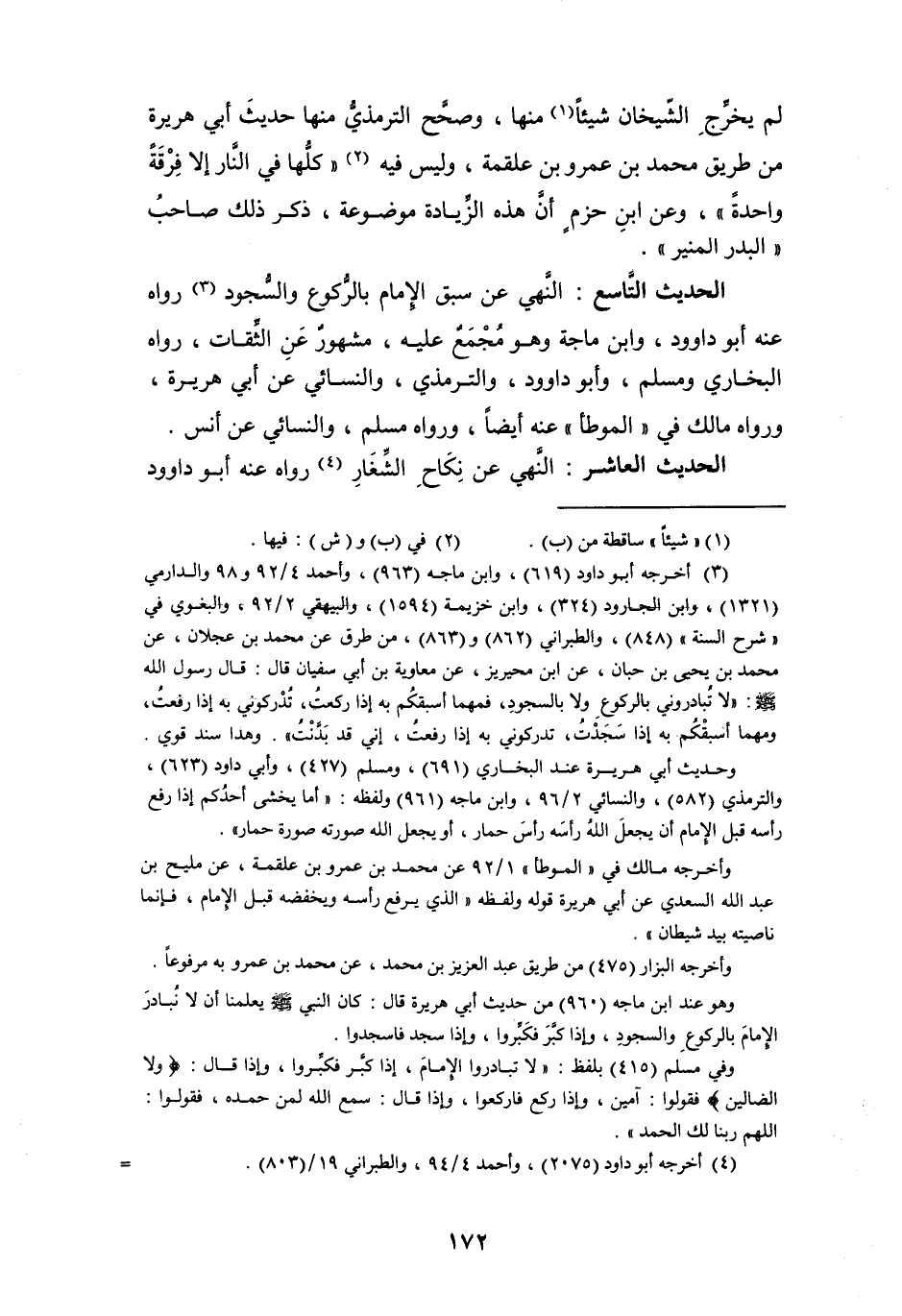 الحديث التَّاسع: النَّهي عن سبق الإمام بالرُّكوع والسُّجود (¬3) رواه عنه أبو داوود، وابن ماجة وهو مُجْمَعٌ عليه، مشهورٌ عَنِ الثِّقات، رواه البخاري ومسلم، وأبو داوود، والترمذي، والنسائي عن أبي هريرة، ورواه مالك في "الموطأ" عنه أيضاً، ورواه مسلم، والنسائي عن أنس.