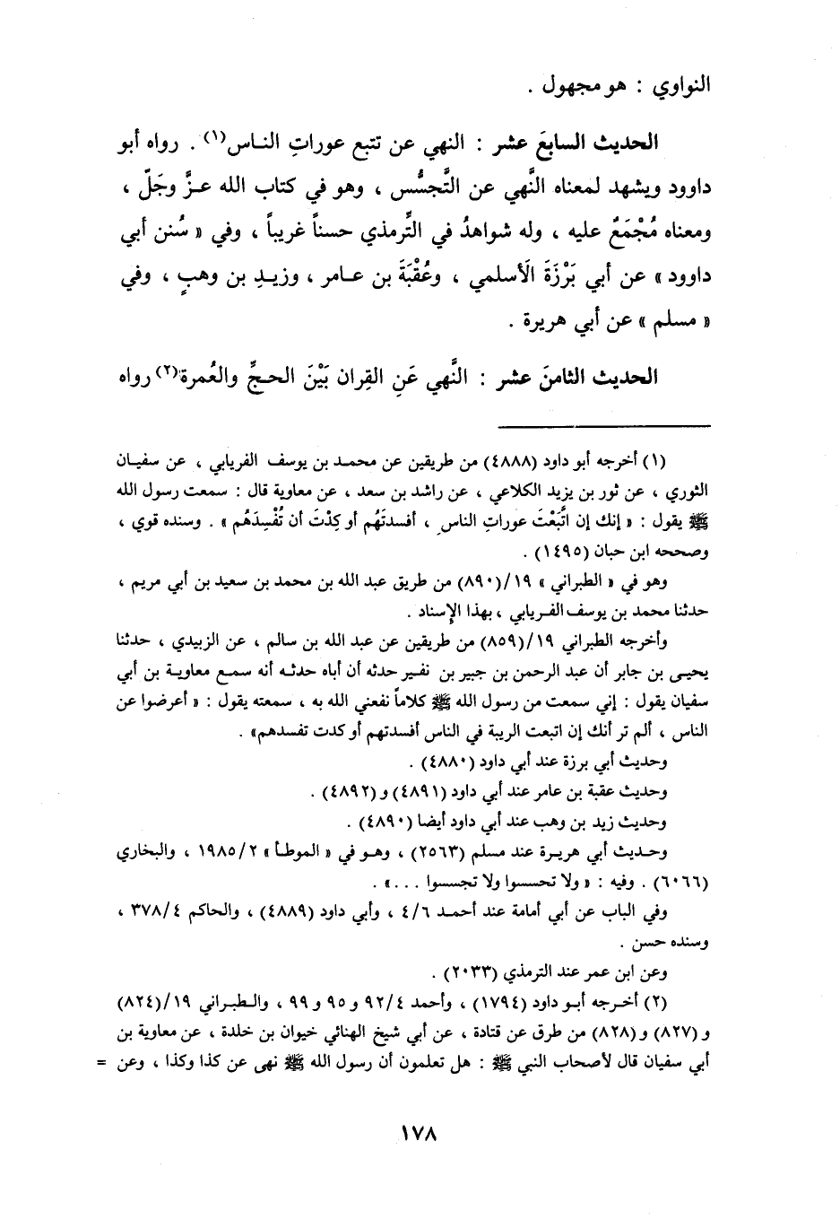الحديث السابعَ عشر: النهي عن تتبع عوراتِ الناس (¬1). رواه أبو داوود ويشهد لمعناه النهي عن التَّجسُّس، وهو في كتاب الله عزَّ وجَلّ، ومعناه مُجْمَعٌ عليه، وله شواهدُ في التِّرمذي حسناً غريباً، وفي " سُنن أبي داوود " عن أبي بَرْزَةَ الَأسلمي، وعُقْبةَ بن عامر، وزيدٍ بن وهبٍ، وفي " مسلم " عن أبي هريرة.