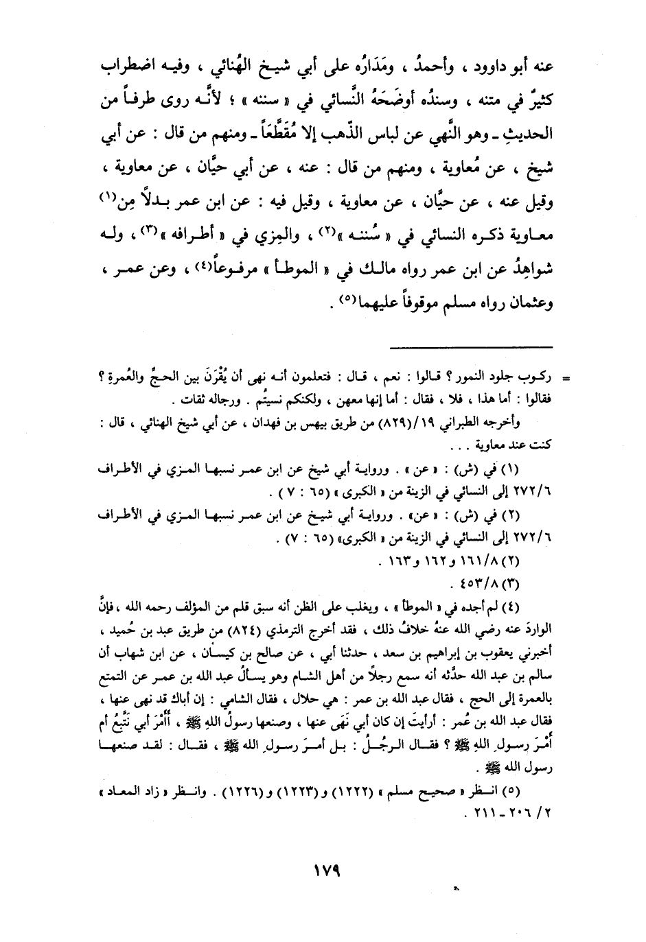 (¬4) لم أجده في " الموطأ "، ويغلب على الظن أنَّه سبق قلم من المؤلف رحمه الله، فإن الواردَ عنه رضي الله عنهُ خلافُ ذلك، فقد أخرج الترمذي (824) من طريق عبد بن حُميد، أخبرني يعقوب بن إبراهيم بن سعد، حدثنا أبي، عن صالح بن كيسان، عن ابن شهاب أن سالم بن عبد الله حدَّثه أنَّه سمع رجلاً من أهل الشام وهو يسألُ عبد الله بن عمر عن التمتع بالعمرة إلى الحج، فقال عبد الله بن عمر: هي حلال، فقال الشامي: إن أباك قد نهى عنها، فقال عبد الله بن عُمر: أرأيتَ إن كان أبي نَهَى عنها، وصنعها رسولُ الله - صلى الله عليه وسلم -، أأمْر أبي نَتَّبعُ أم أمْرَ رسولِ اللهِ - صلى الله عليه وسلم -؟ فقال الرجُلُ: بل أمرَ رسول الله - صلى الله عليه وسلم -، فقال: لقد صنعها رسول الله - صلى الله عليه وسلم -.