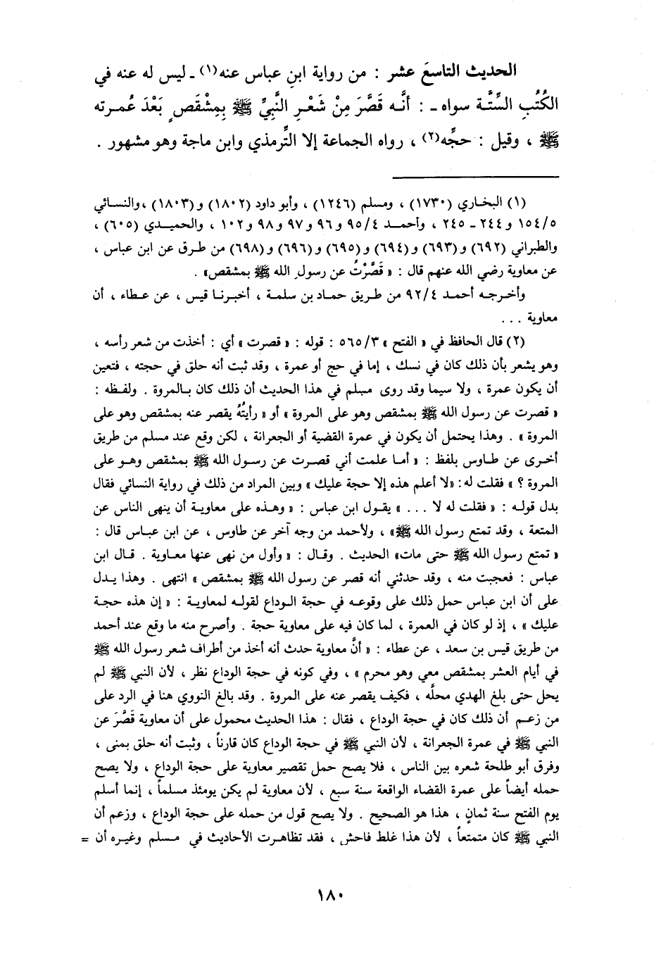 (¬2) قال الحافظ في " الفتح " 3/ 565: قوله: " قصرت " أي: أخذت من شعر رأسه، وهو يشعر بأن ذلك كان في نسك، إما في جع أو عمرة، وقد ثبت أنَّه حلق في حجته، فتعين أن يكون عمرة، ولا سيما وقد روى مسلم في هذا الحديث أن ذلك كان بالمروة. ولفظه: " قصرت عن رسول الله - صلى الله عليه وسلم - بمشقص وهو على المروة " أو" رأيتُهُ يقصر عنه بمشقص وهو على المروة ". وهذا يحتمل أن يكون في عمرة القضية أو الجعرانة، لكن وقع عند مسلم من طريق أخرى عن طاوس بلفظ: " أما علمت أني قصرت عن رسول الله - صلى الله عليه وسلم - بمشقص وهو على المروة؟ " فقلت له: " لا أعلم هذه إلا حجة عليك " وبين المراد من ذلك في رواية النسائي فقال بدل قوله: " فقلت له لا ... " يقول ابن عباس: " وهذه على معاوية أن ينهى الناس عن المتعة، وقد تمتع رسول الله - صلى الله عليه وسلم - "، ولأحمد من وجه آخر عن طاوس، عن ابن عباس قال: " تمتع رسول الله - صلى الله عليه وسلم - حتى مات " الحديث. وقال: " وأول من نهى عنها معاوية. قال ابن عباس: فعجبت منه، وقد حدثني أنَّه قصر عن رسول الله - صلى الله عليه وسلم - بمشقص " انتهى. وهذا يدل على أن ابن عباس حمل ذلك على وقوعه في حجة الوداع لقوله لمعاوية: " إن هذه حجة عليك "، إذ لو كان في العمرة، لما كان فيه على معاوية حجة. وأصرح منه ما وقع عند أحمد من طريق قيس بن سعد، عن عطاء: " أنَّ معاوية حدث أنَّه أخذ من أطراف شعر رسول الله - صلى الله عليه وسلم - في أيام العشر بمشقص معي وهو محرم "، وفي كونه في حجة الوداع نظر، لأن النبي - صلى الله عليه وسلم - لم يحل حتى بلغ الهدي محلَّه، فكيف يقصر عنه على المروة. وقد بالغ النووي هنا في الرد على من زعم أن ذلك كان في حجة الوداع، فقال: هذا الحديث محمول على أن معاوية قَصَّرَ عن النبي - صلى الله عليه وسلم - في عمرة الجعرانة، لأن النبي - صلى الله عليه وسلم - في حجة الوداع كان قارناً، وثبت أنَّه حلق بمنى، وفرق أبو طلحة شعره بين الناس، فلا يصح حمل تقصير معاوية على حجة الوداع، ولا يصح حمله أيضاً على عمرة القضاء الواقعة سنة سبع، لأن معاوية لم يكن يومئذ مسلماً، إنما أسلم يوم الفتح سنة ثمانٍ، هذا هو الصحيح. ولا يصح قول من حمله على حجة الوداع، وزعم أن النبي - صلى الله عليه وسلم - كان متمتعاً، لأن هذا غلط فاحش، فقد تظاهرت الأحاديث في مسلم وغيره أن =